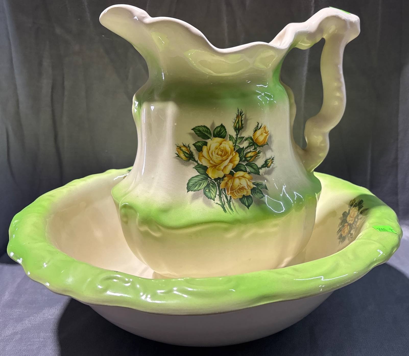 2000 Pitcher and Wash Basin by Parce Ceramics Inc., USA, With Yellow Rose Design 15”x5”, 7”x12”