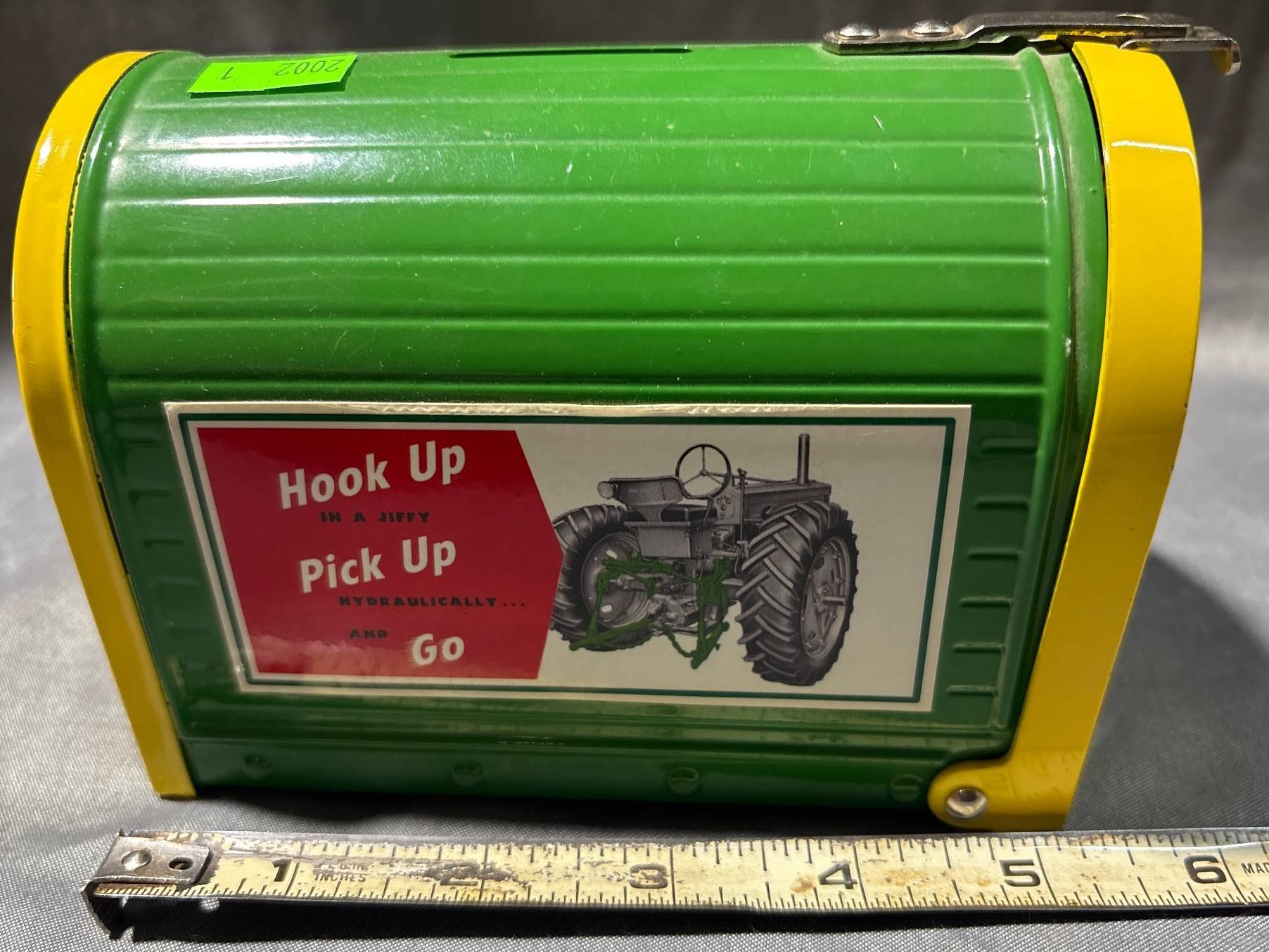 2002 John Deere Tin Mailbox Bank with Advertising Graphics 5.5”x3.5”x4”