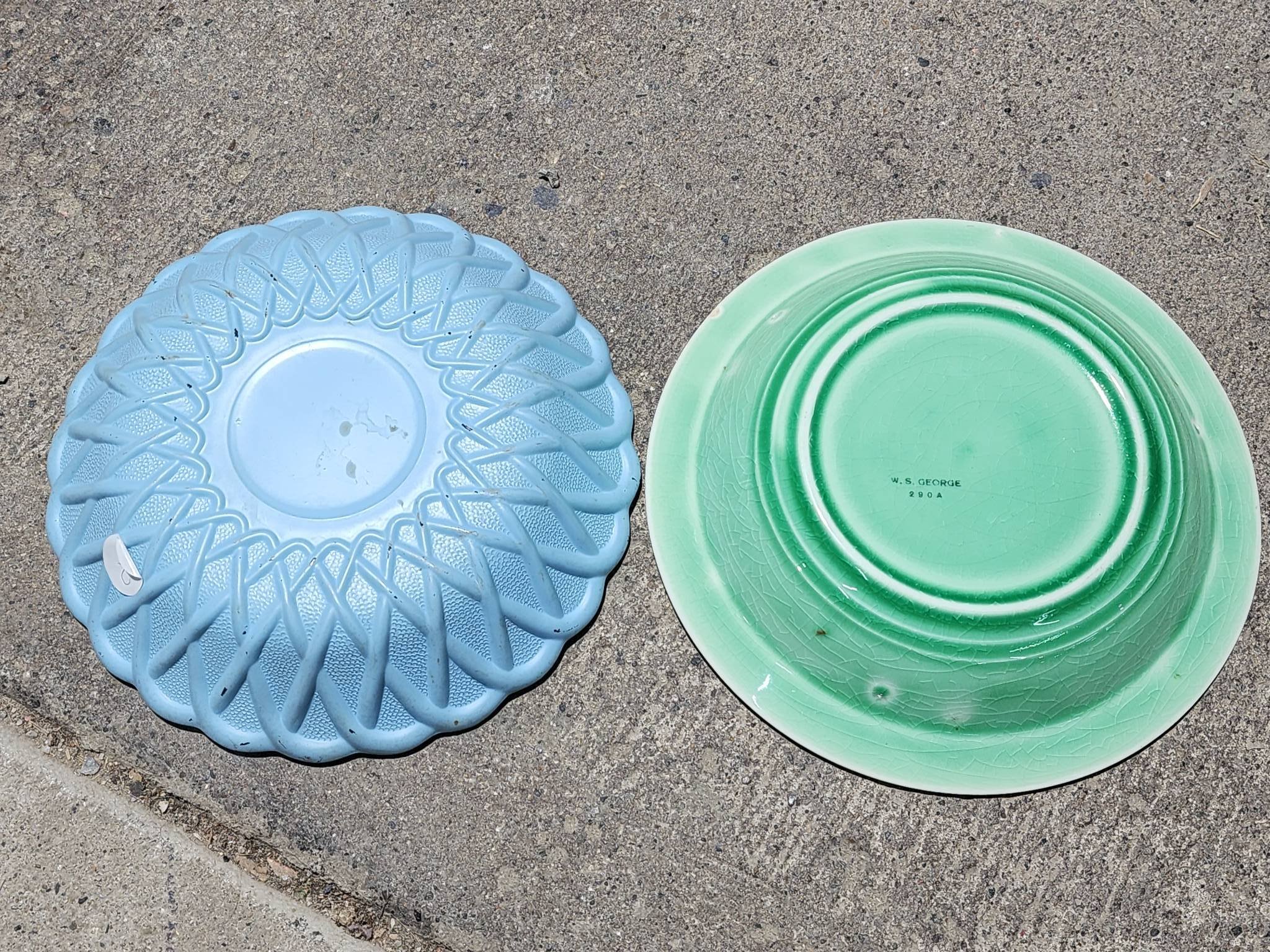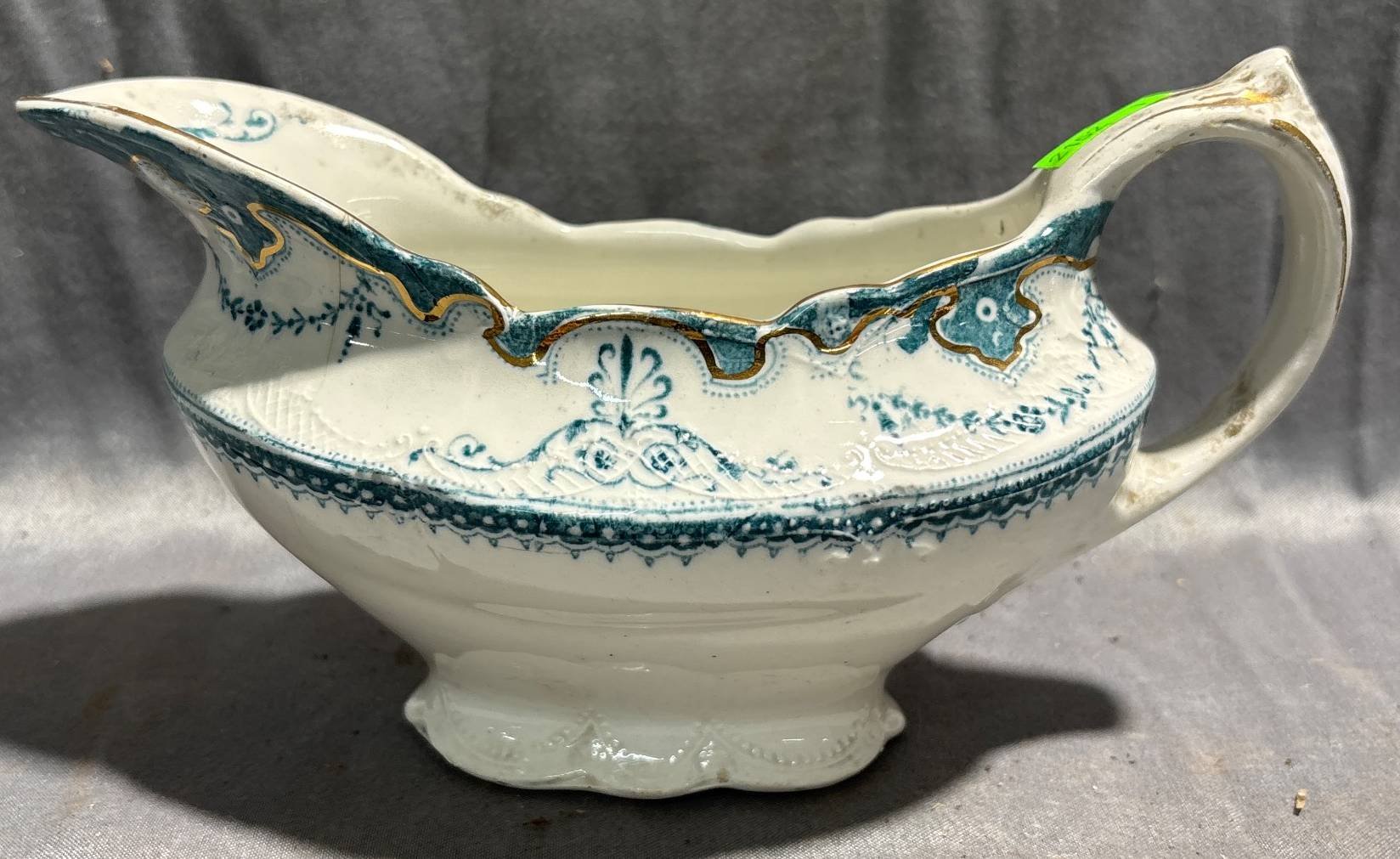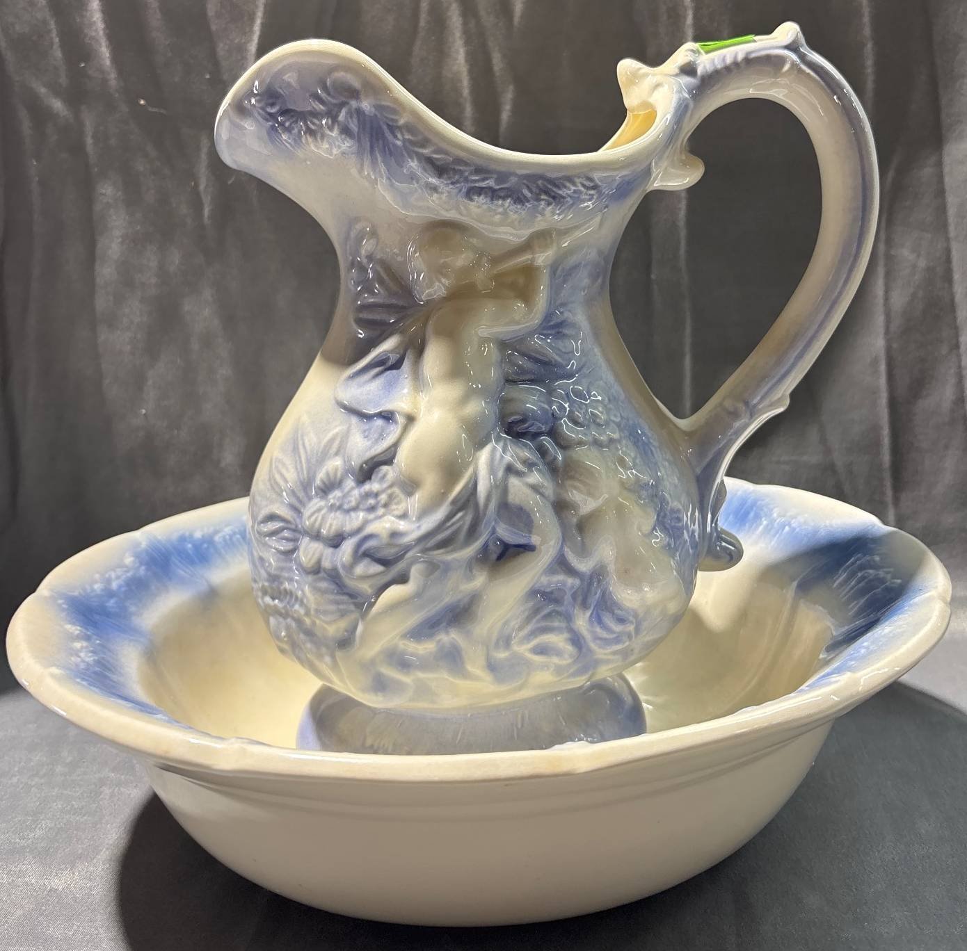 2003 Blue and White Wash Pitcher and Basin with Figural Relief Design 13”x4”, 7”x11”