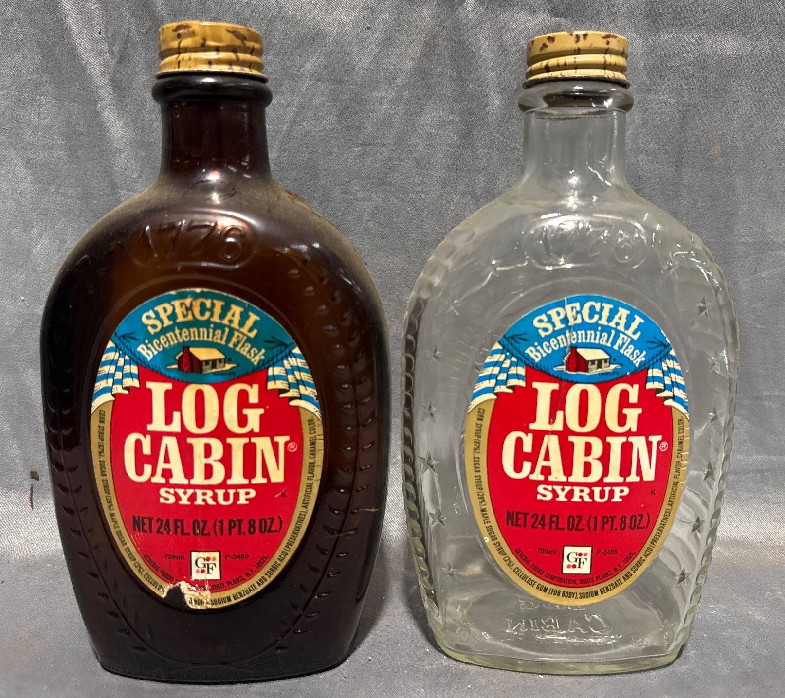 2038 2 Log Cabin Syrup Bicentennial Glass Bottles with Metal Caps, 1776 Design, 8.5”, Empty