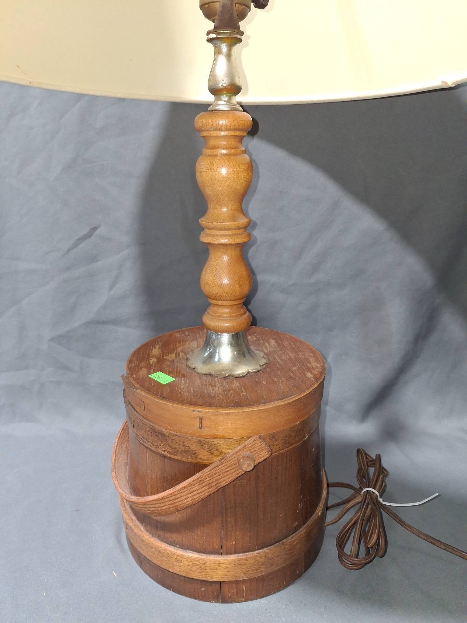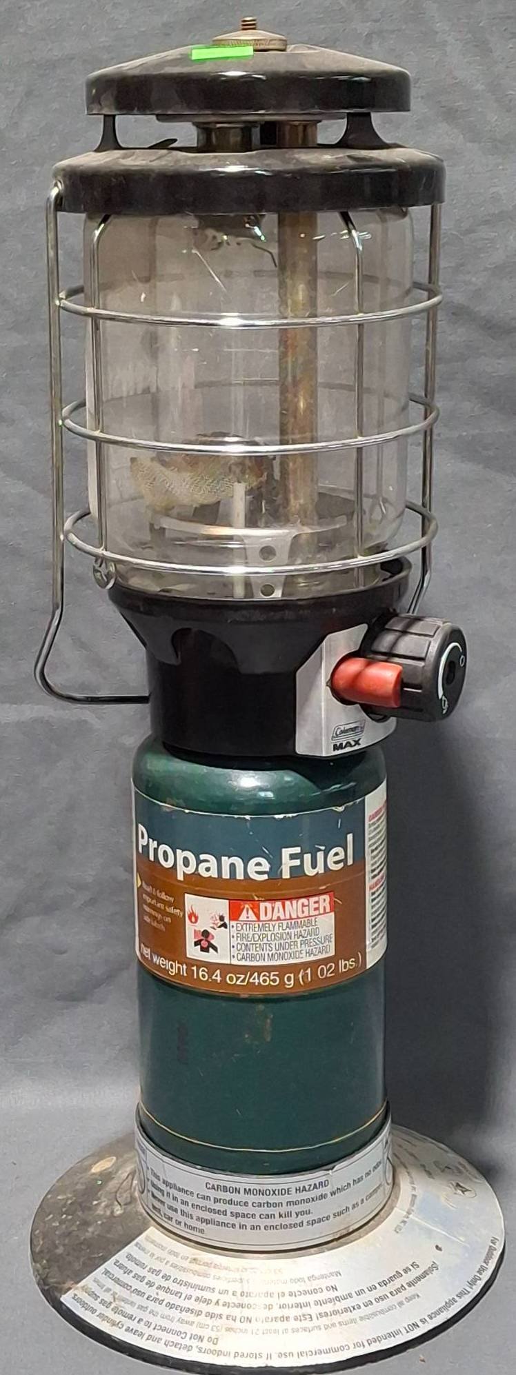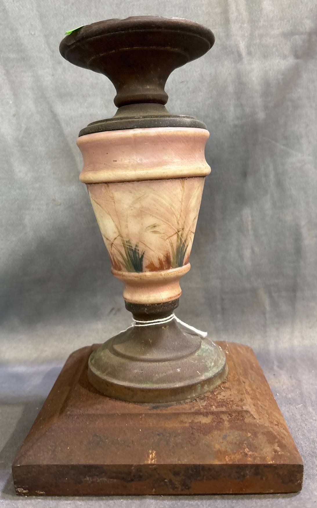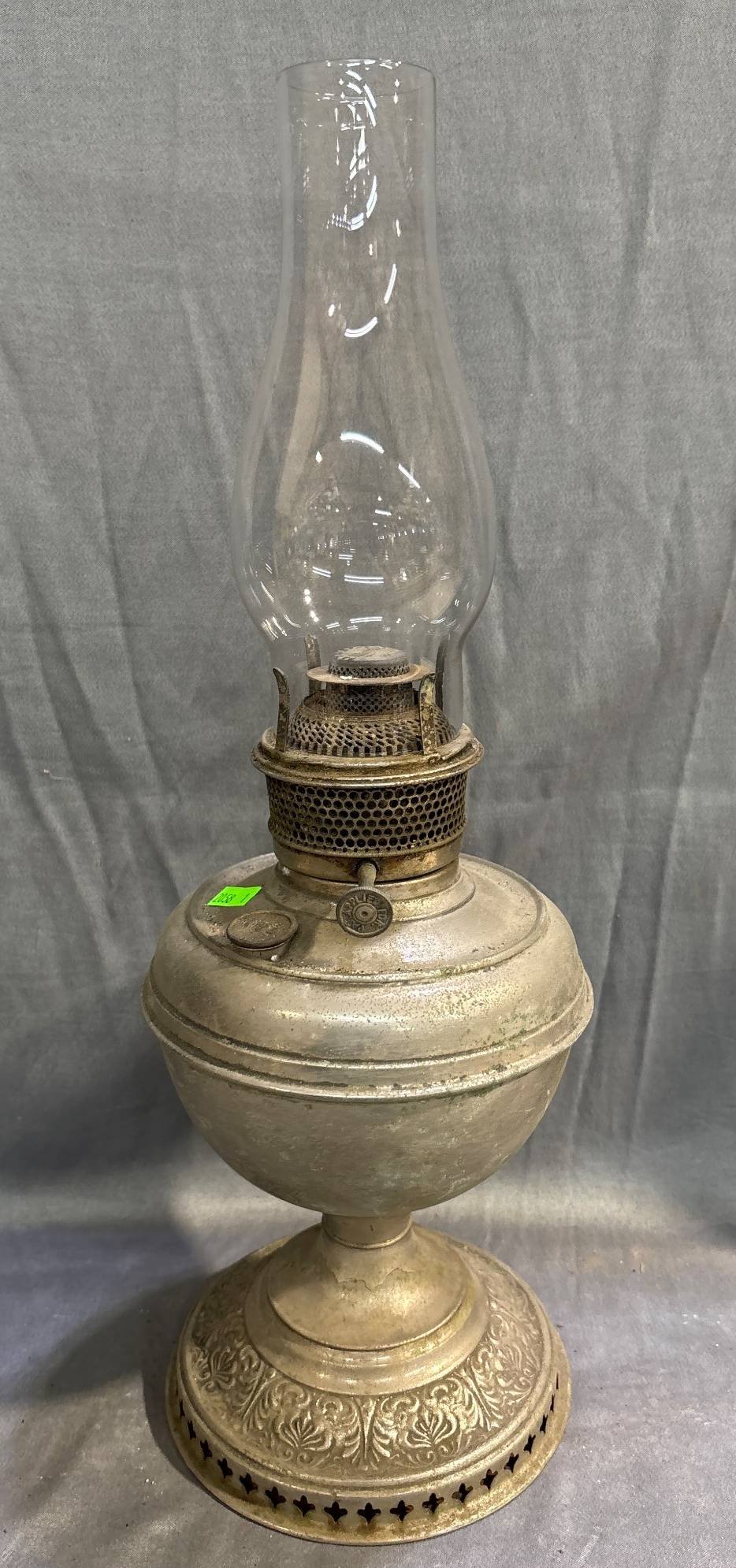 2058 Metal Oil Lamp with Glass Chimney and Turn Knob Marked ‘Pat. Applied For’, 19”