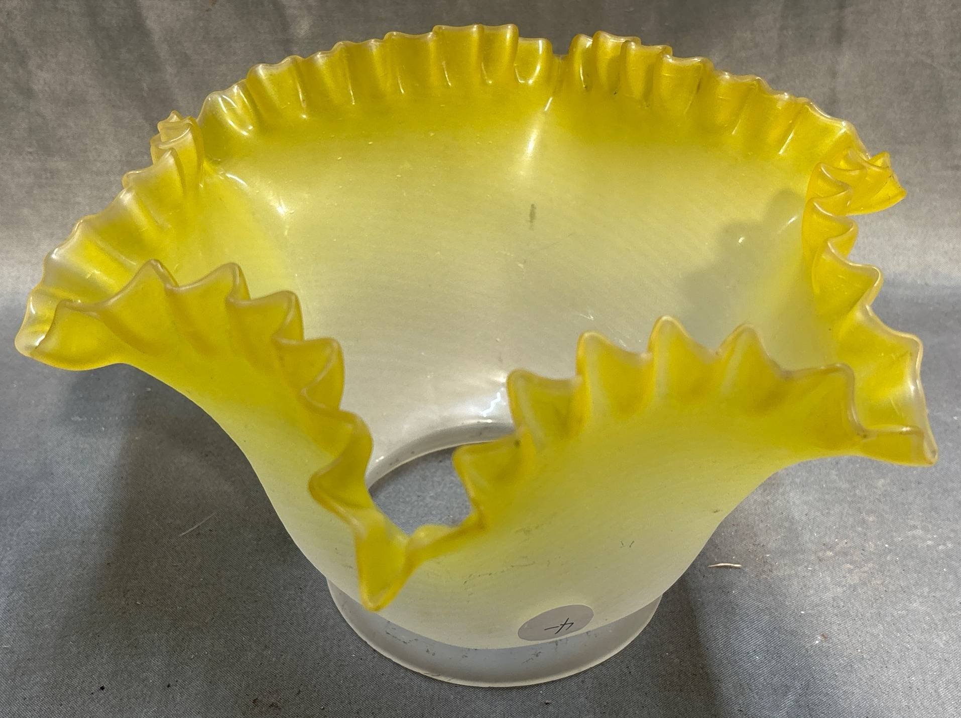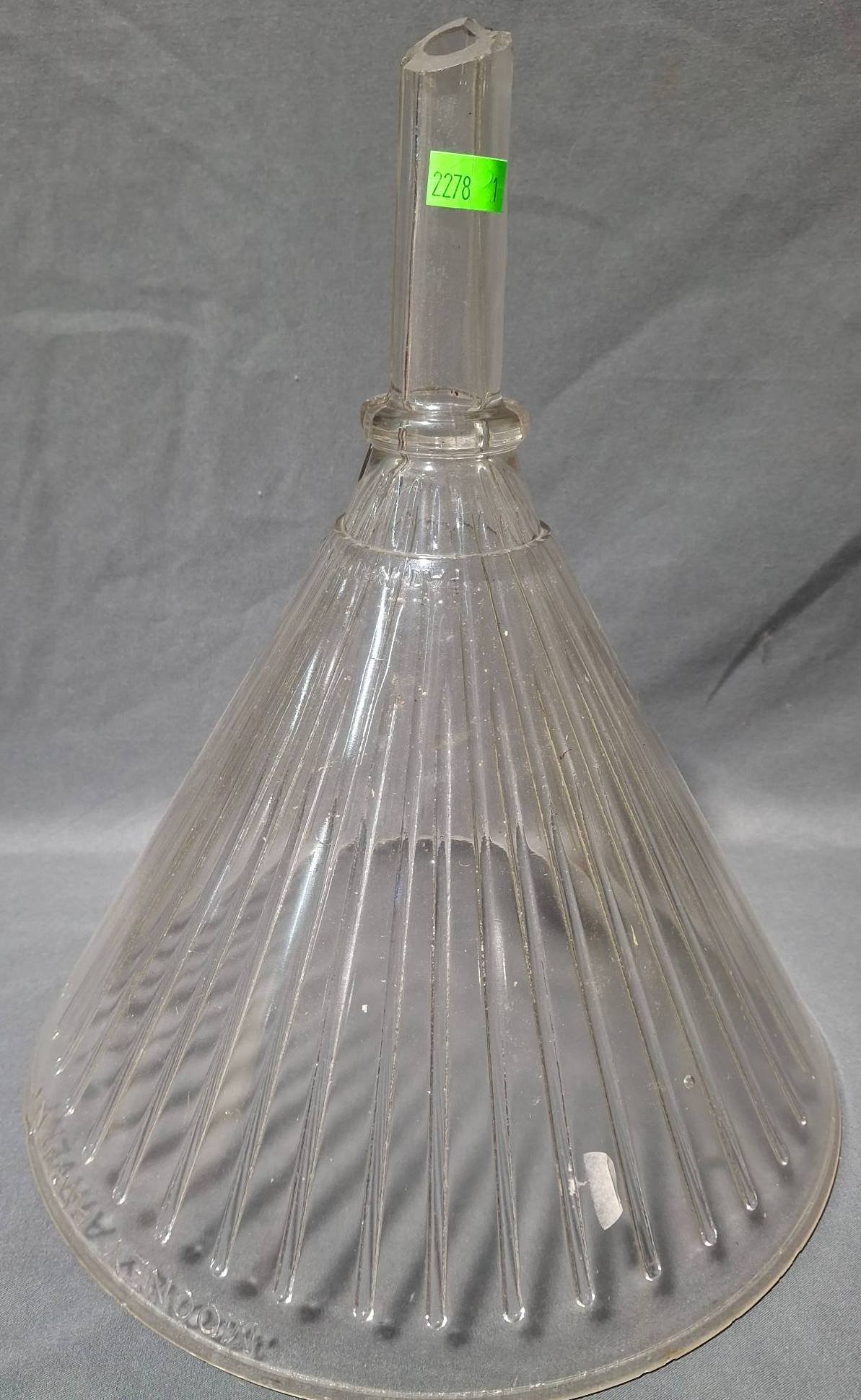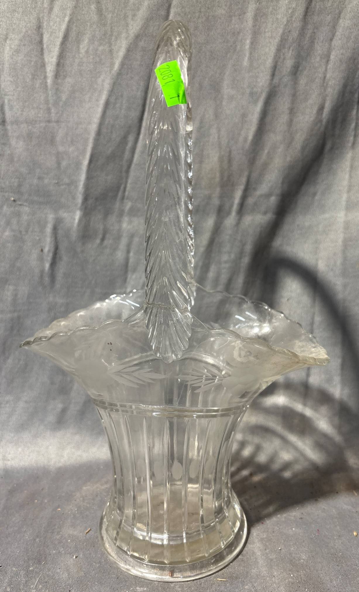 2081 Pressed Glass Basket with Ribbed Design and Arched Handle Brocken Handle 13”