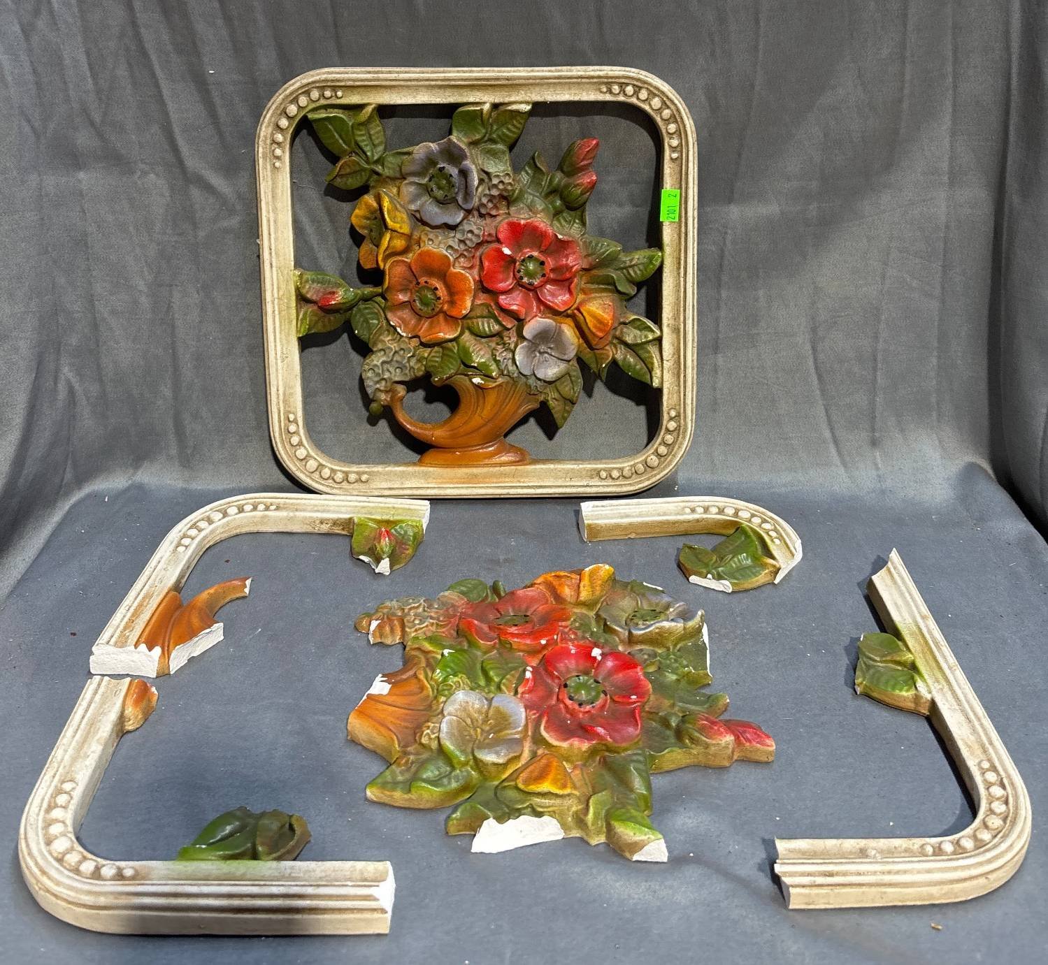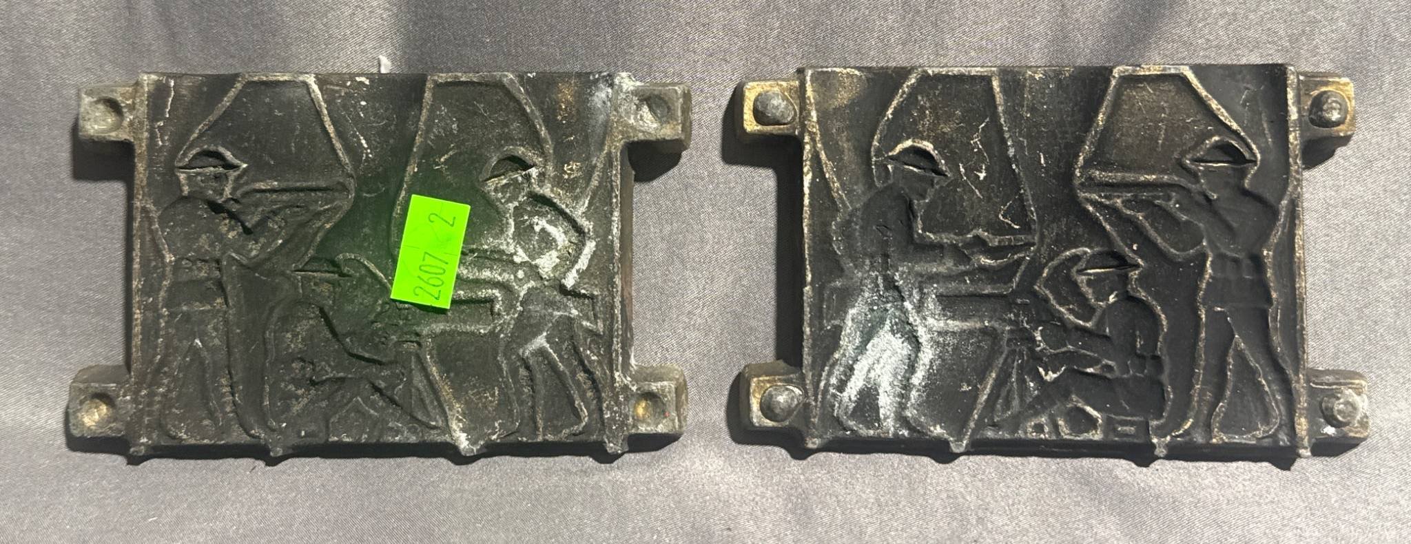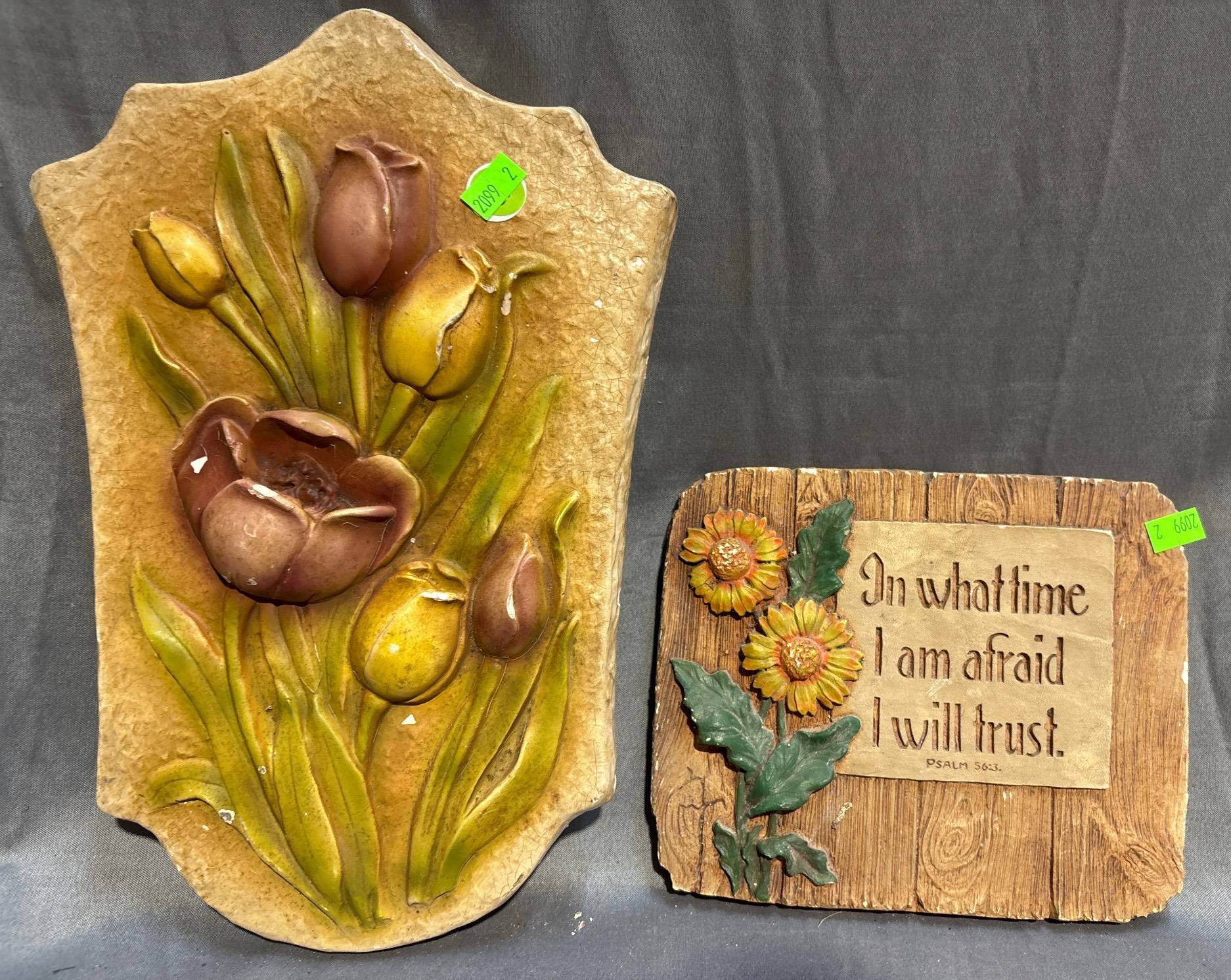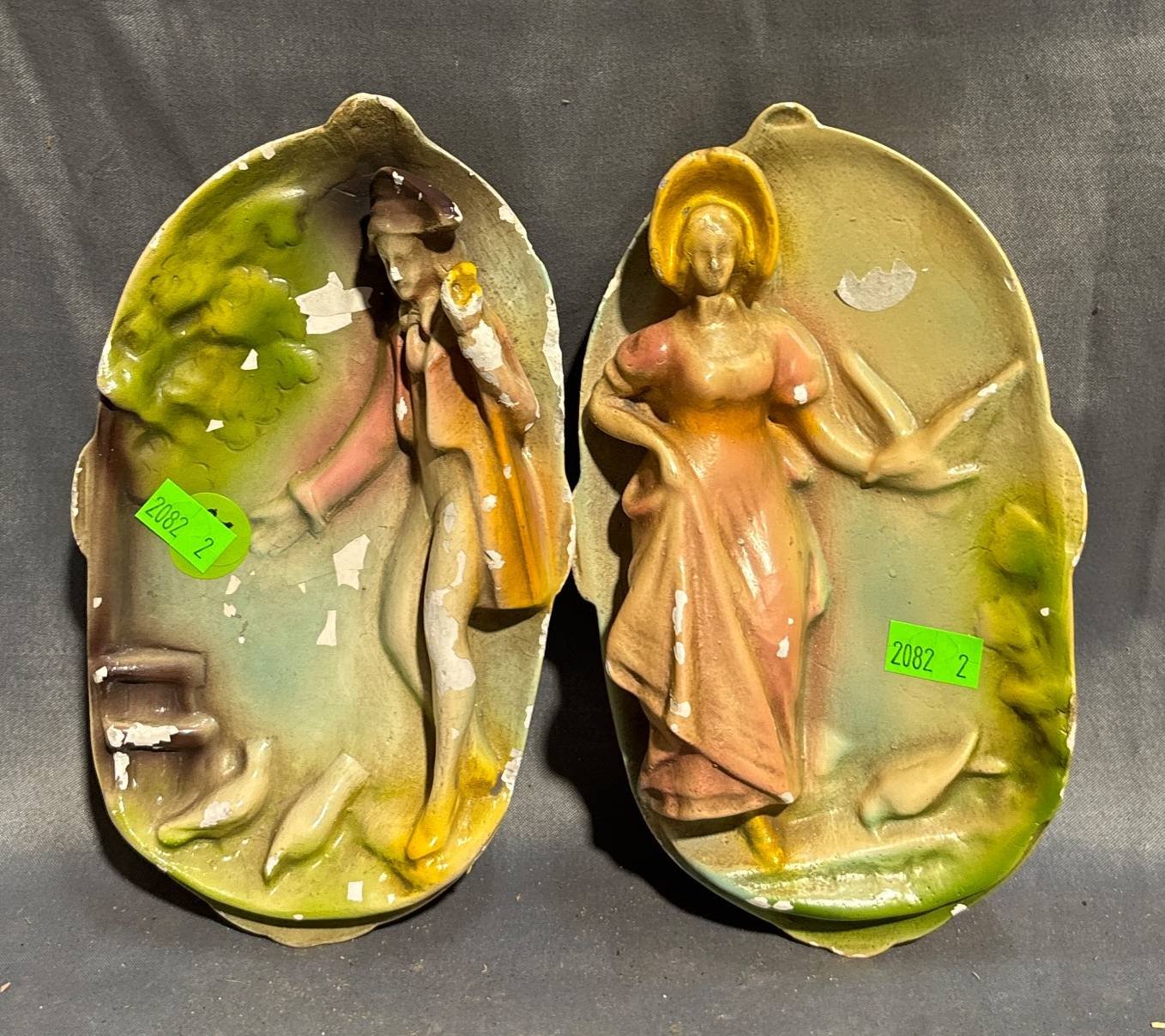 2082 2 Hand-Painted Chalkware Wall Plaques with Pastoral Figures 7”x5”, Chips