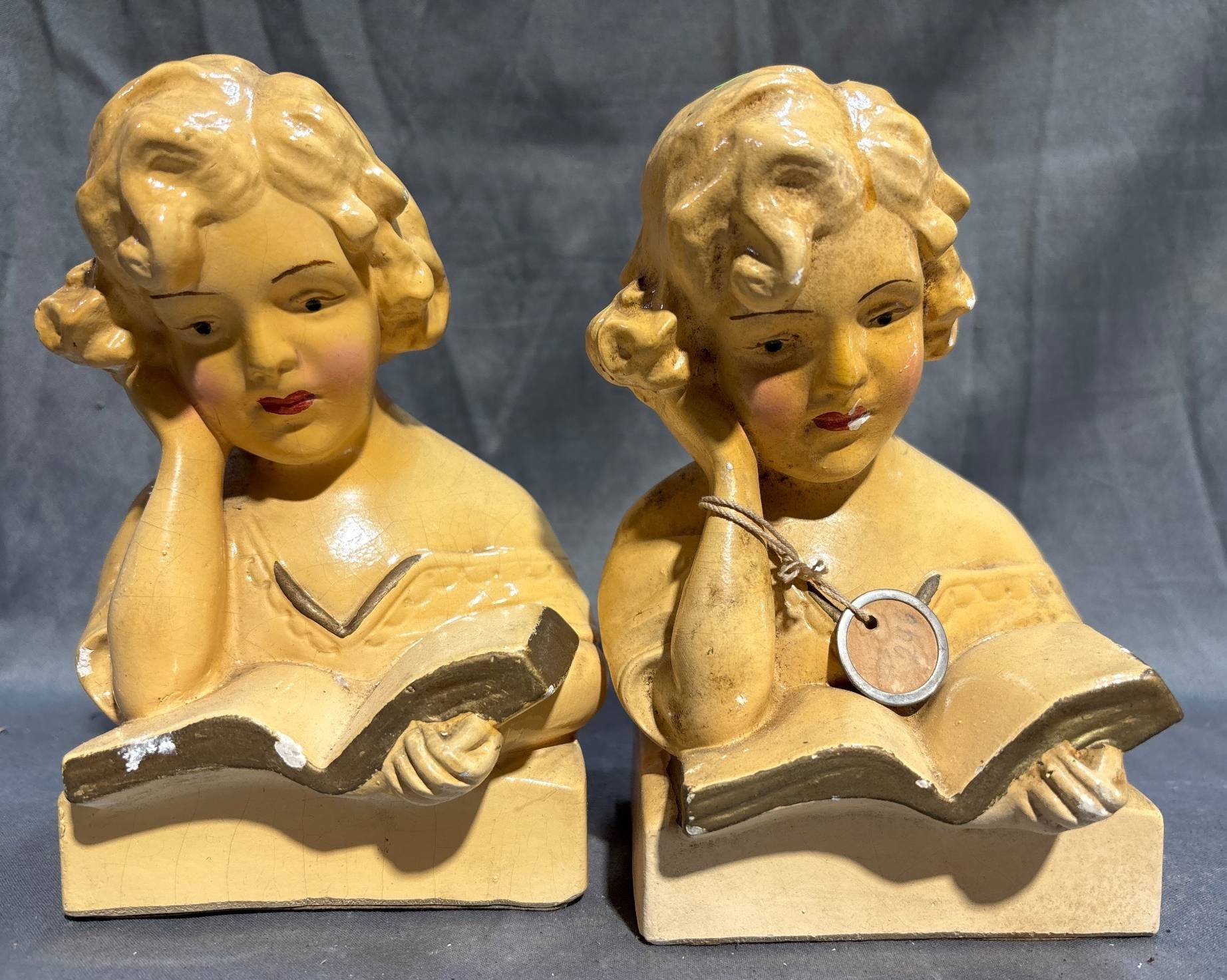 2084 2 Figural Plaster Bookend Sculptures Depicting Children Reading 4”x3.5”x7”