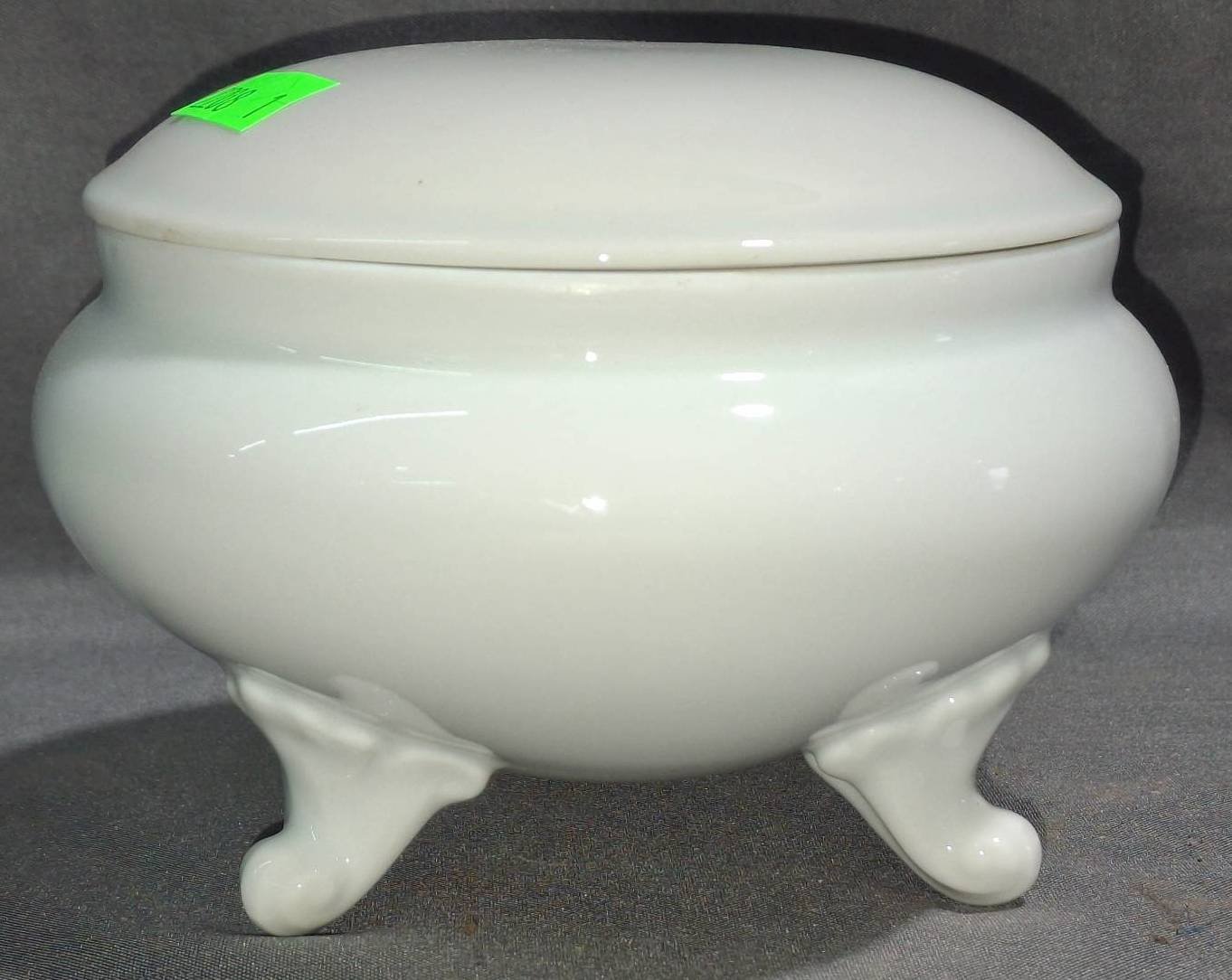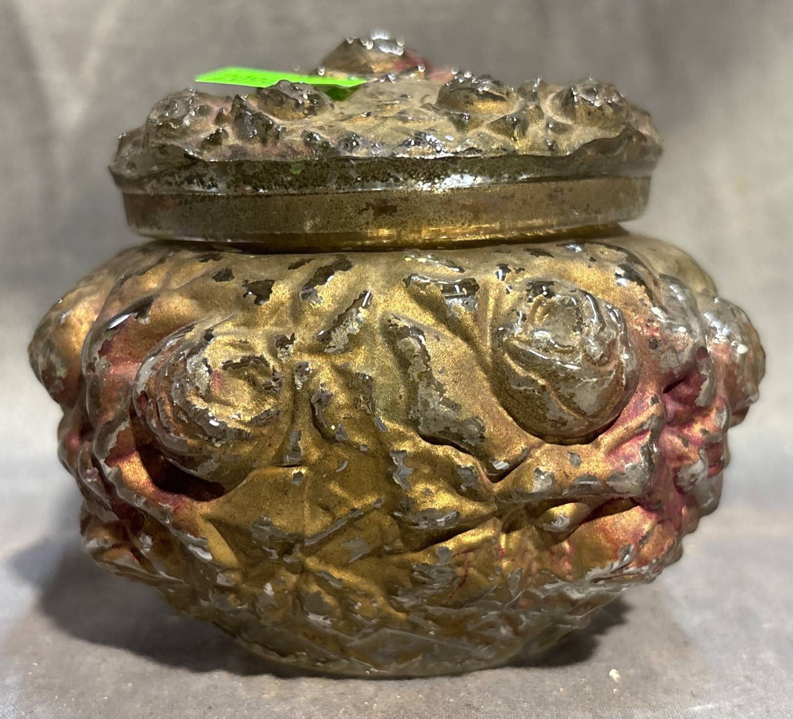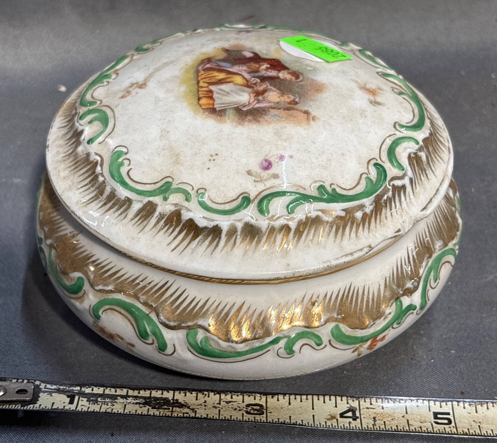 2086 Lidded Dish with Hand-Painted Green and Gold Details 4.5”x3”, Chip on Edge