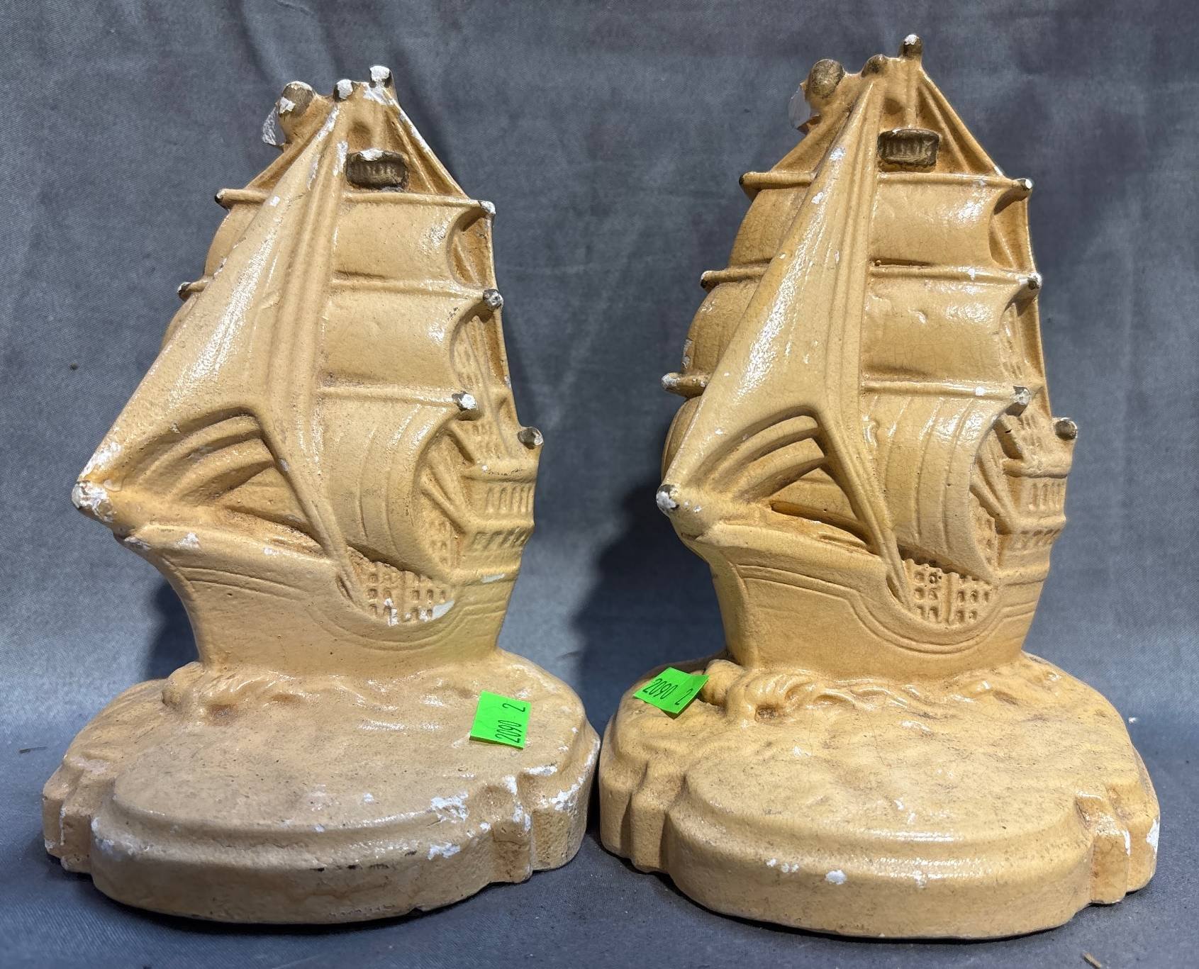 2090 Chalk Ware Ship-Themed Bookends with Painted Detailing 7”, Chips