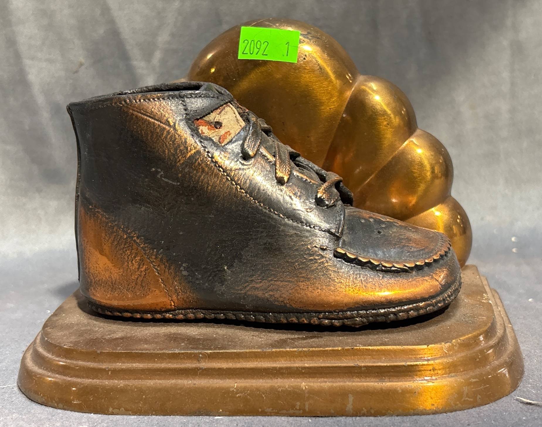 2092 Copper Bronze-Toned Metal Shoe Sculpture With Fan-Shaped Backing 6”x4”x4”
