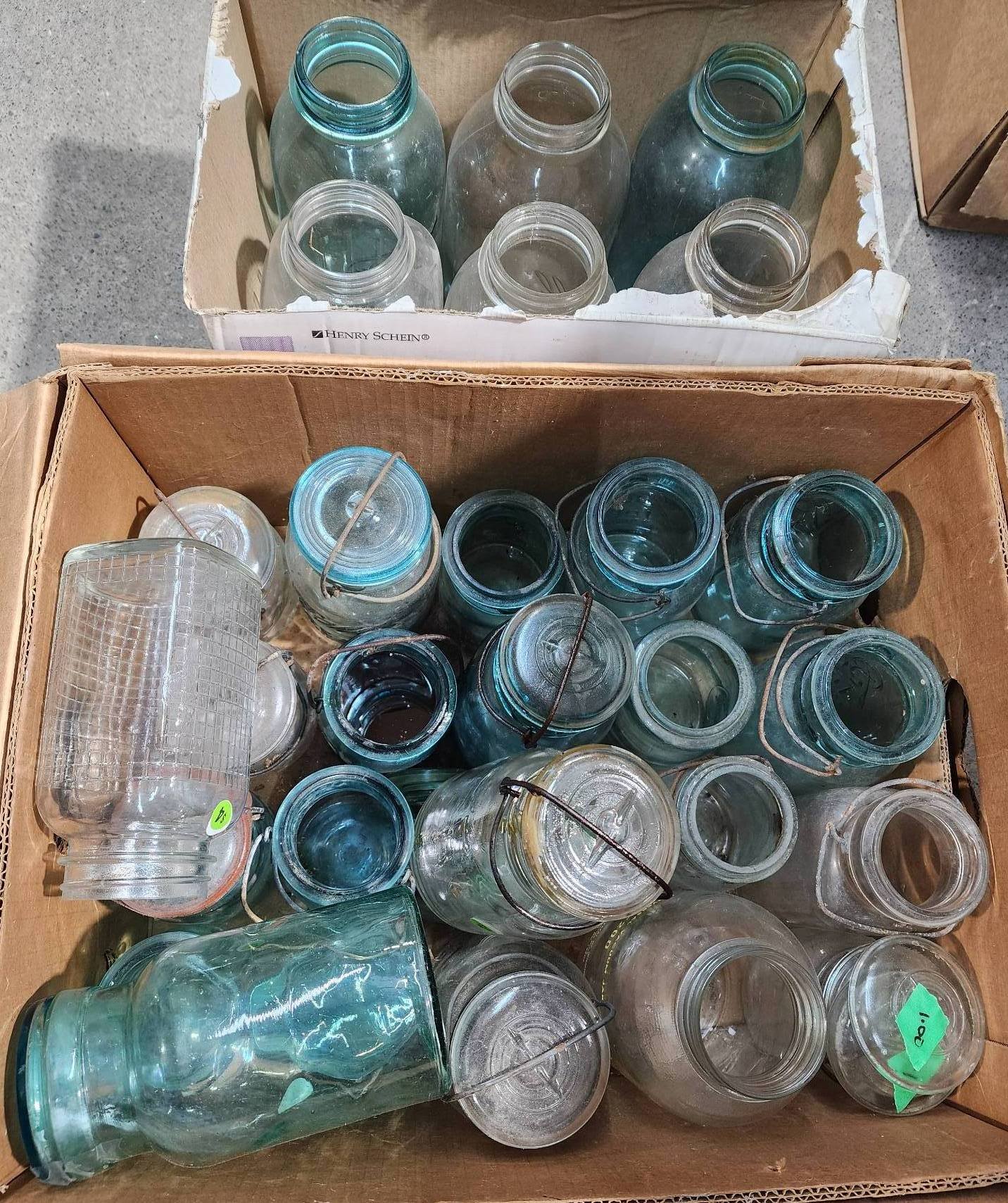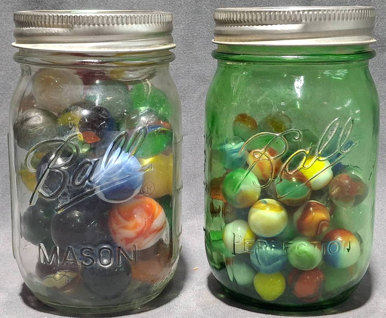 2054 Two Blue Ball Glass Jars Filled with Buttons, Half Gal