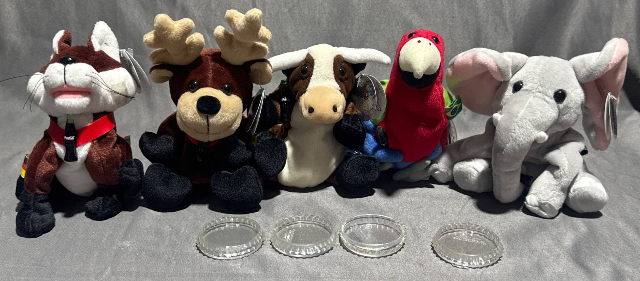 30016 5 Coca-Cola International Bean Bag Plush Toys w/ Plastic Bottles Inc. Moose, Cow and Parrot, 3”-6”