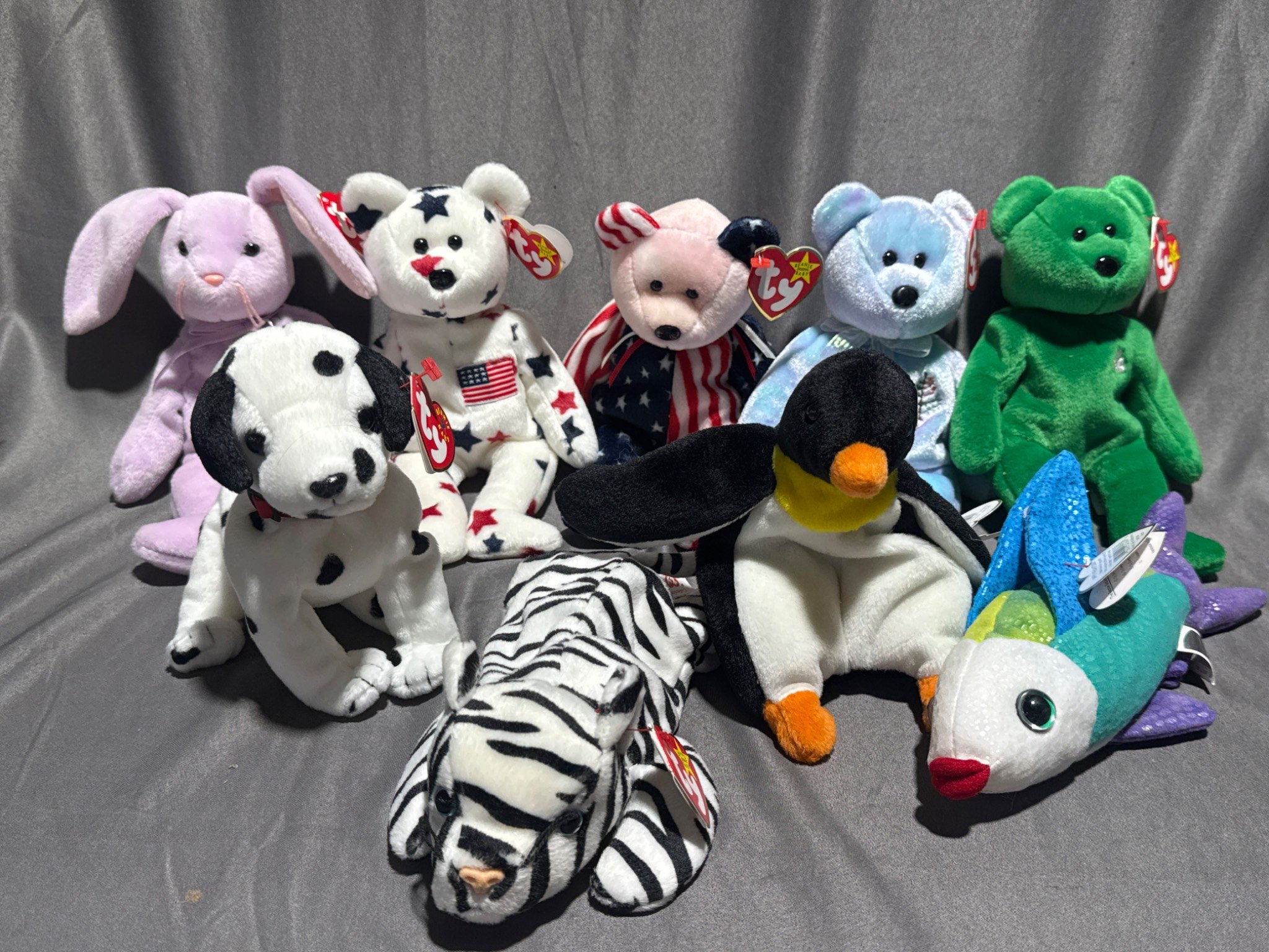 30086 9 TY Beanie Babies Plush Toys with Tags inc. Batty, Erin, Knuckles, Ringo, Peace, Glory, Valentino, Curly, and Fortune