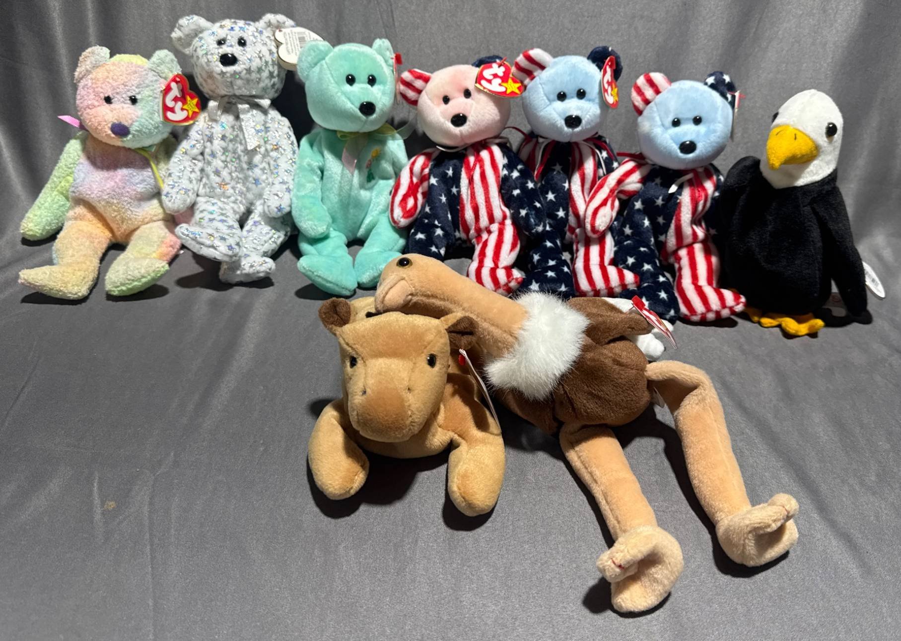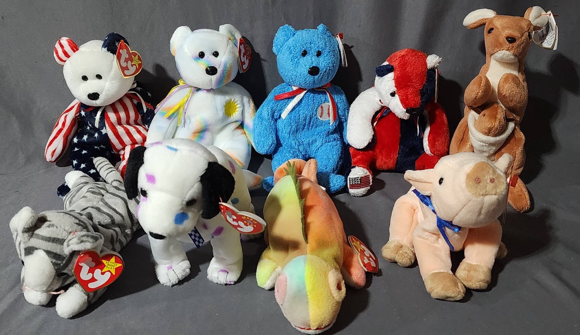 30050 9 TY Beanie Babies Plush Toys with Tags Inc. Patriotic Bears, Kangaroo and Iguana