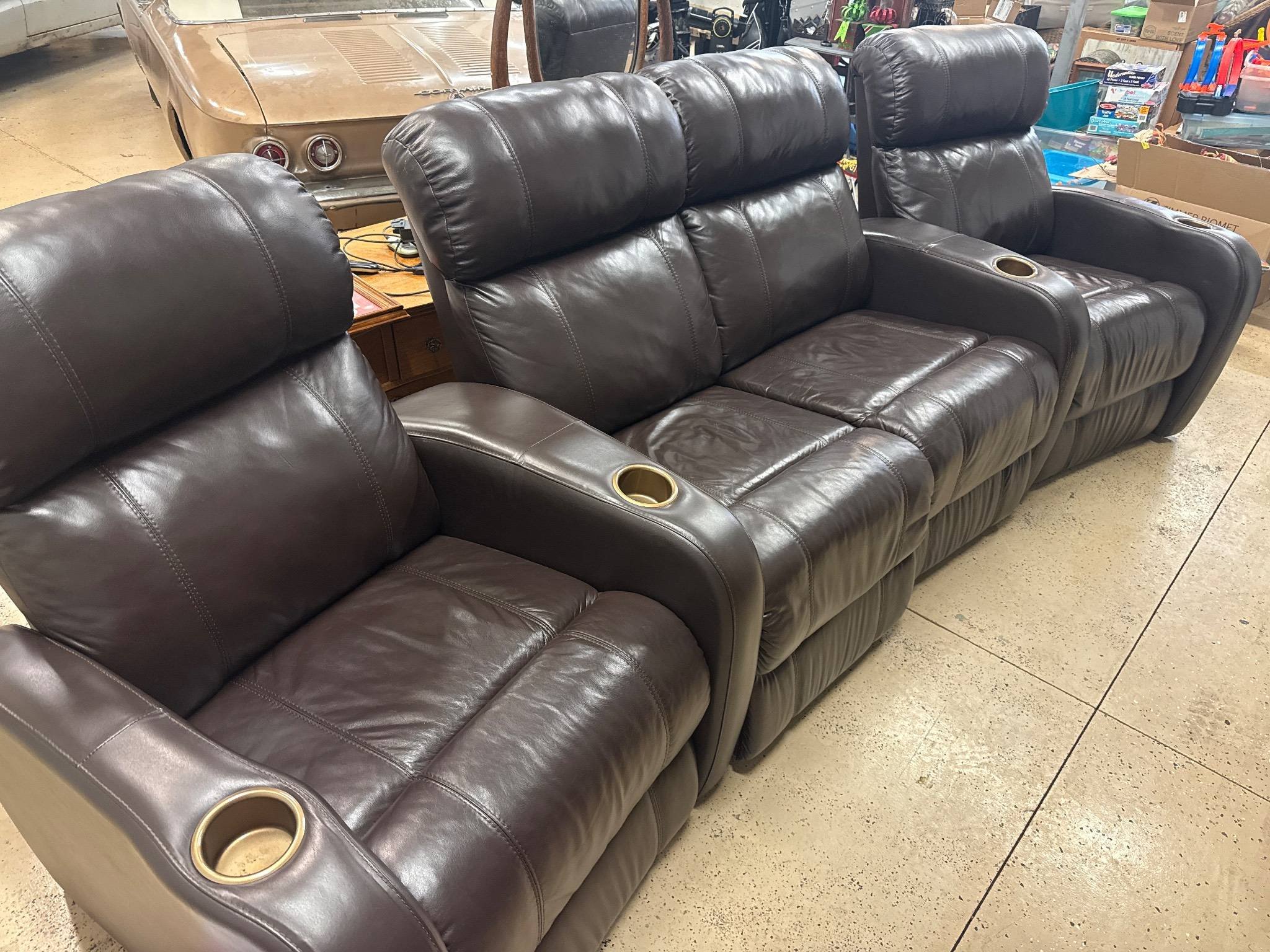 104 3 Section Electric Reclining Couch with Brown Upholstery and Cup Holders, 121”x40”x29”, untested