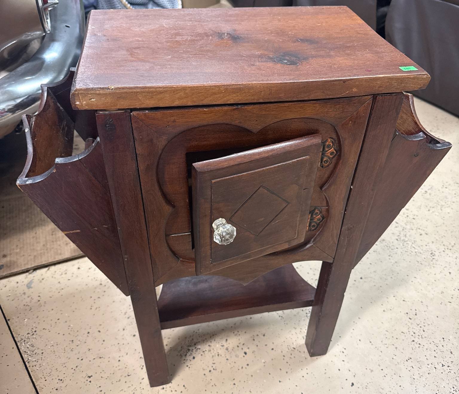 107 Carved Side Table with Hinged Door and Side Compartments, 27”x27”x12”