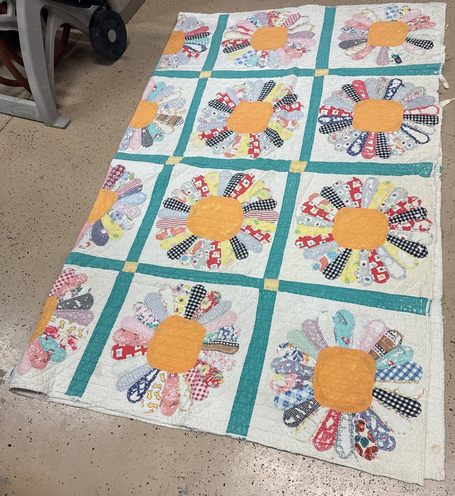 120 Multicolor Quilted Textile with Floral Motif, 65”x82”, Tattered and Stains