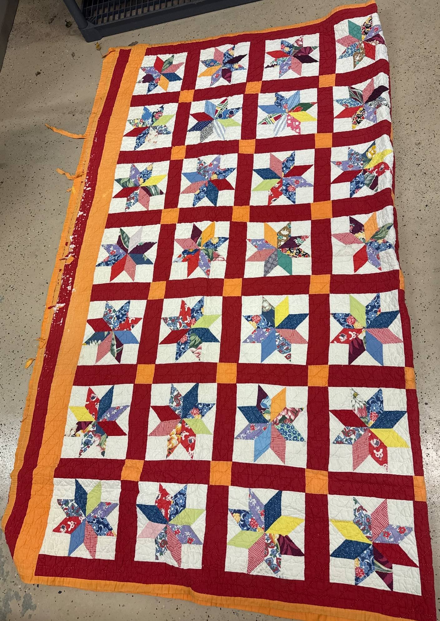 121 Patchwork Star Quilt with Red, White, and Multicolor Design, 73”x88”, Freyed Edges and Stains