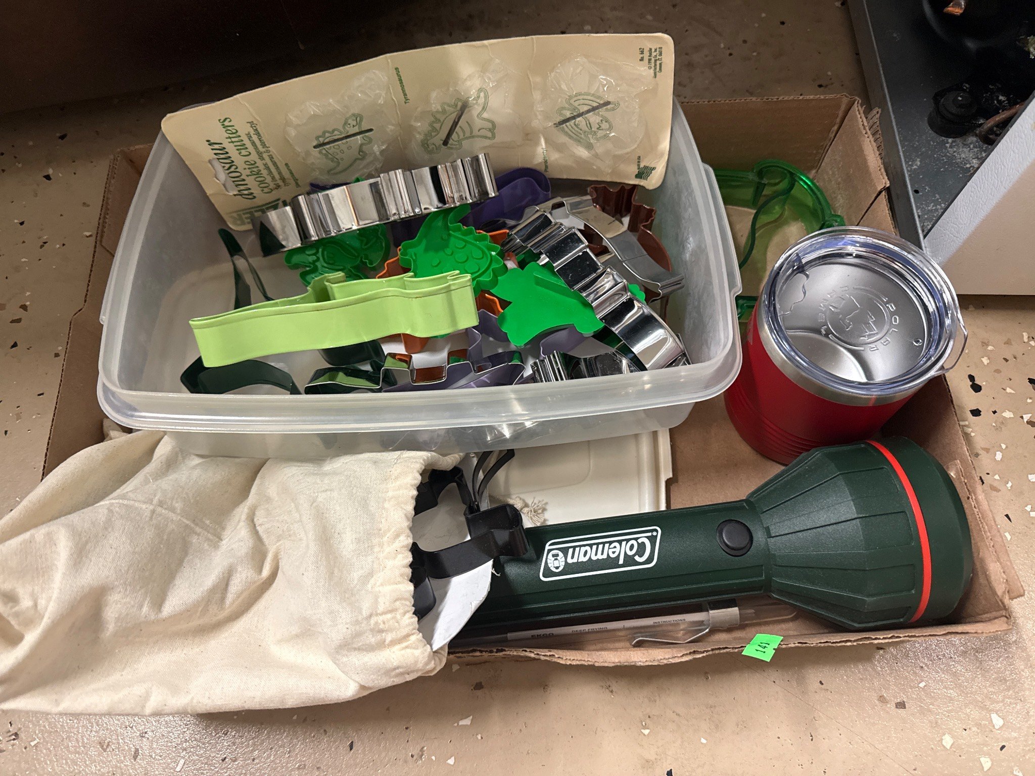 141 Metal and Plastic Cookie Cutters, Coleman Flashlight, and Red Polar Camel Insulated Tumbler