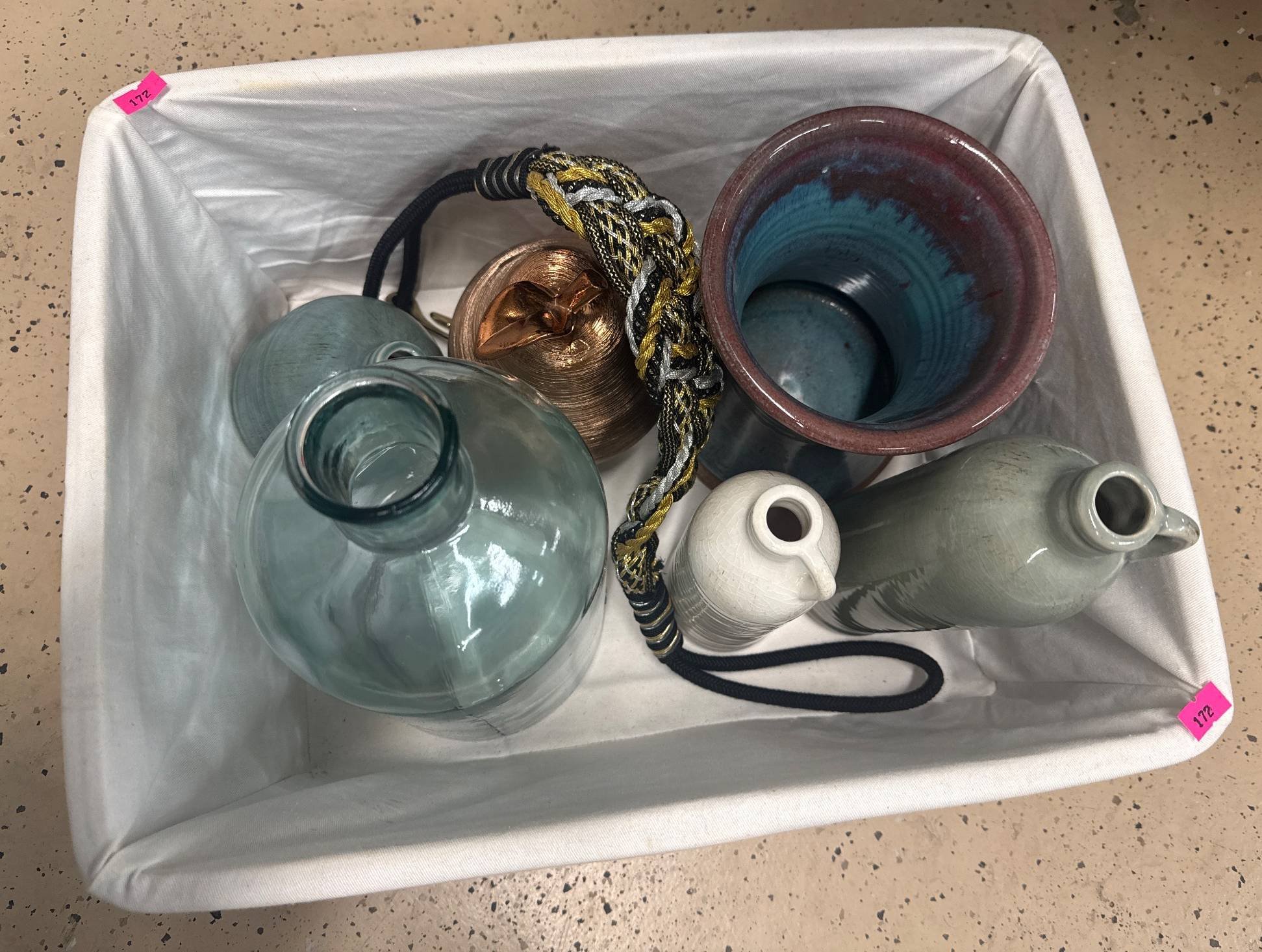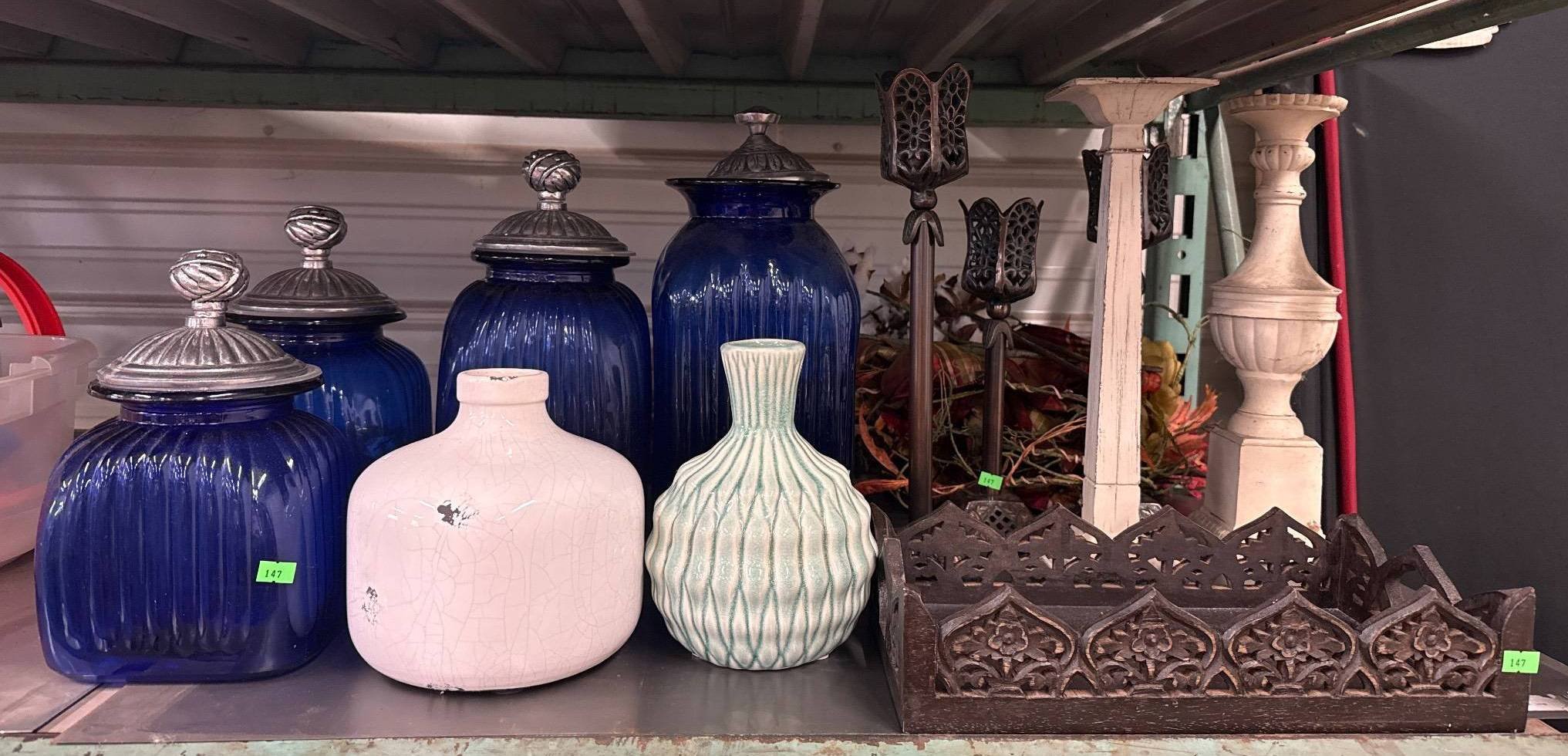 147 Blue Glass Canisters with Lids, Decorative Vases, Candleholders, and Carved Tray, Chips