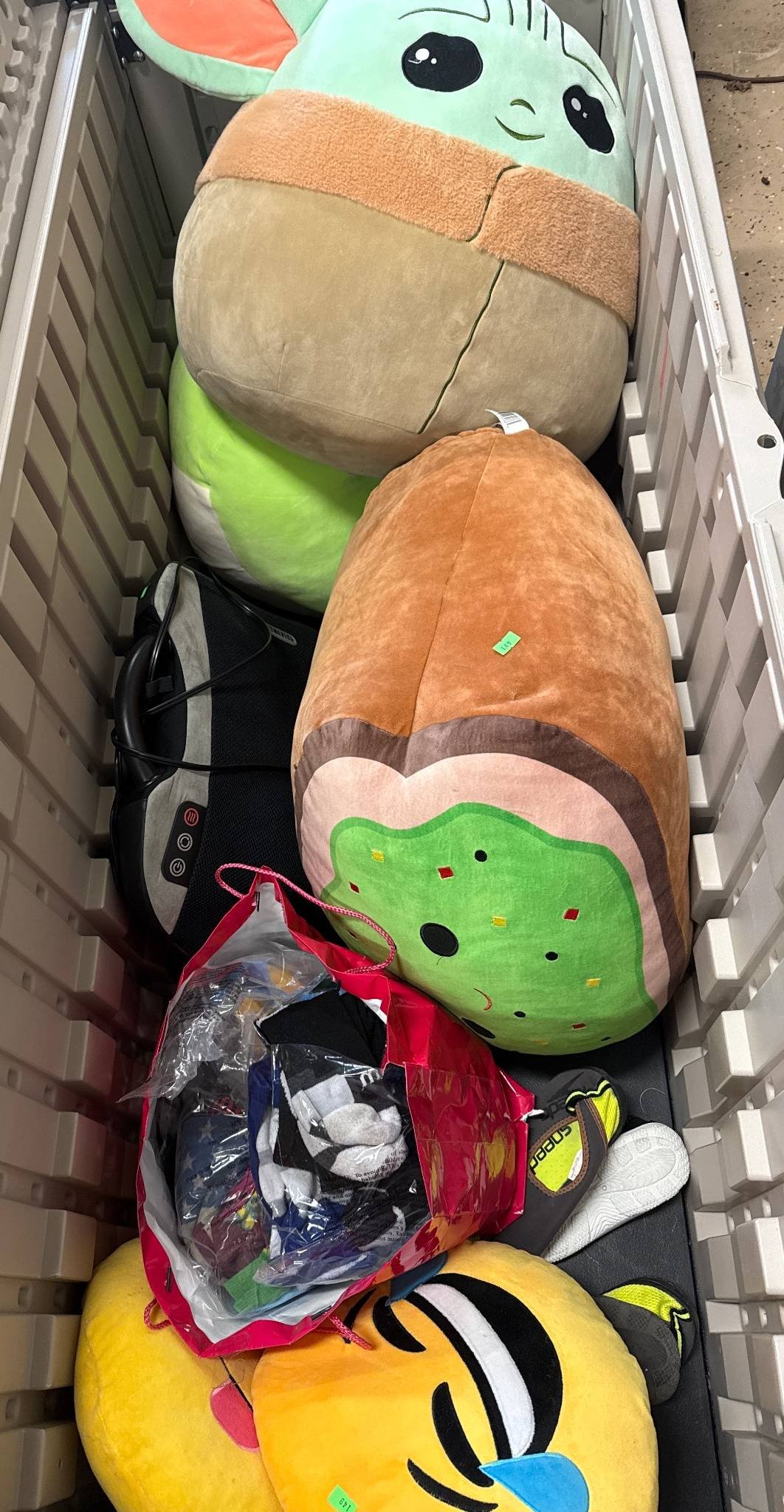 149 Plush Toys, Homedics Massage Cushion, And Bag With Socks, TOYS ONLY, Container NOT INCLUDED