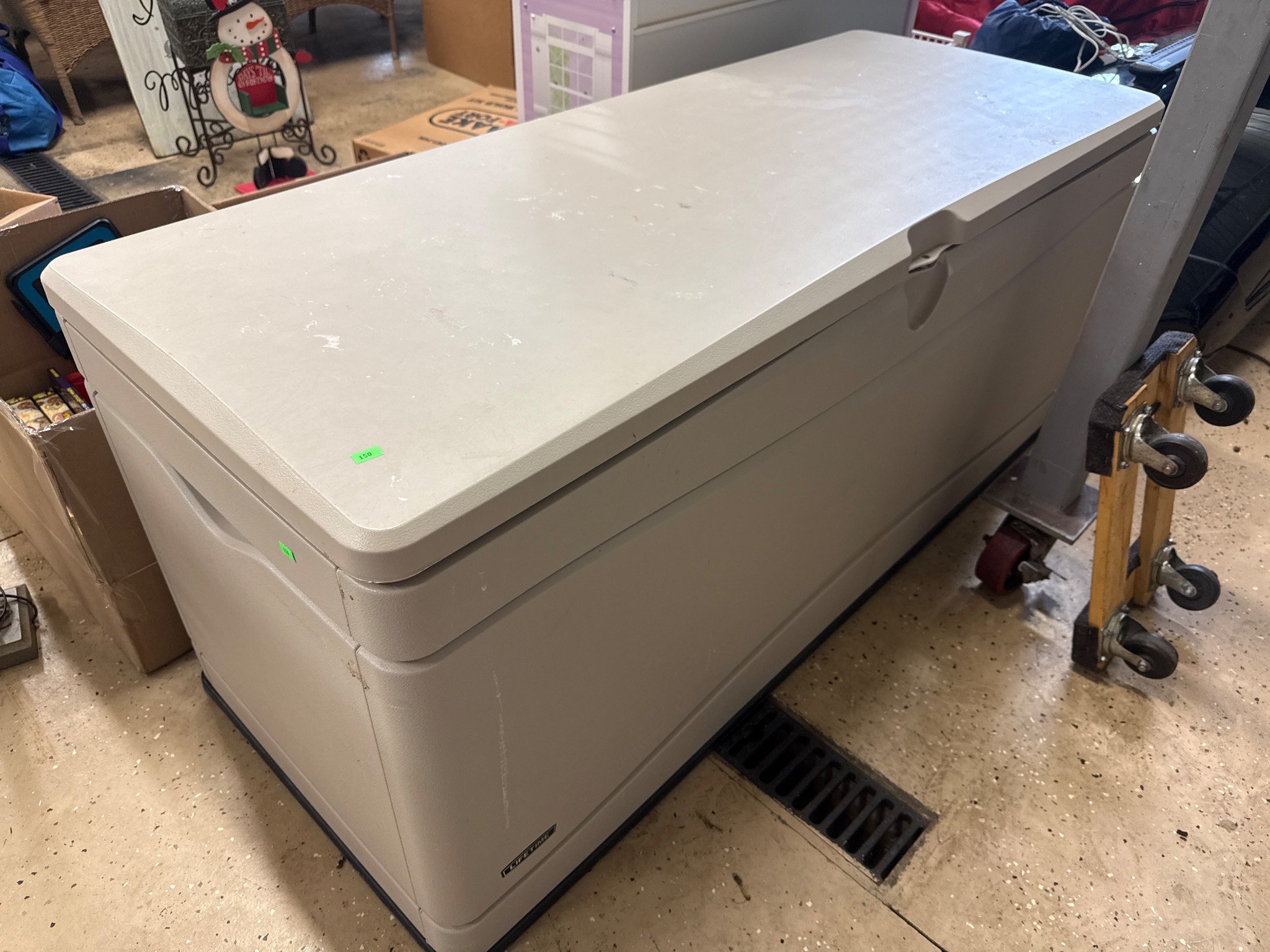 150 Lifetime Plastic Outdoor Storage Container, 61”x25”x28”, CONTAINER ONLY, ITEMS AROUND AND IN NOT INCLUDED