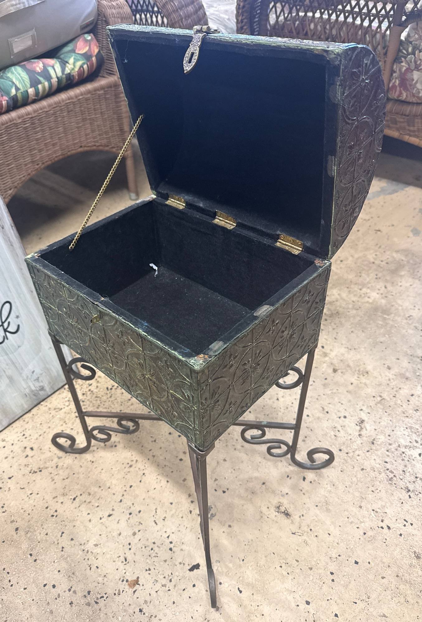 162 Metal Chest with Embossed Design on Scroll Iron Base, 22? x 12? x 13?