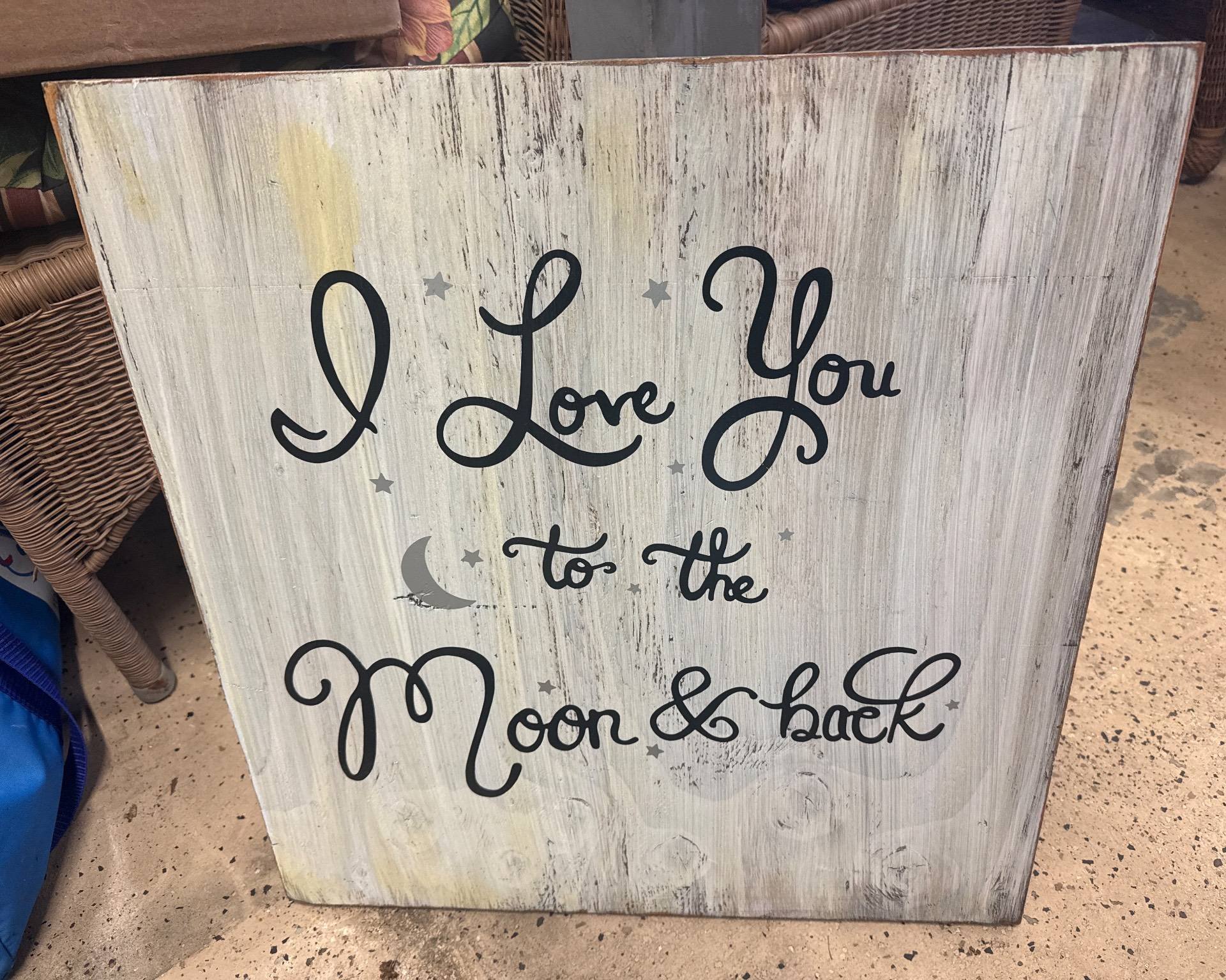 164 Square Wall Plaque with ‘I Love You to the Moon & Back’ Text, 23”x22”, Stains