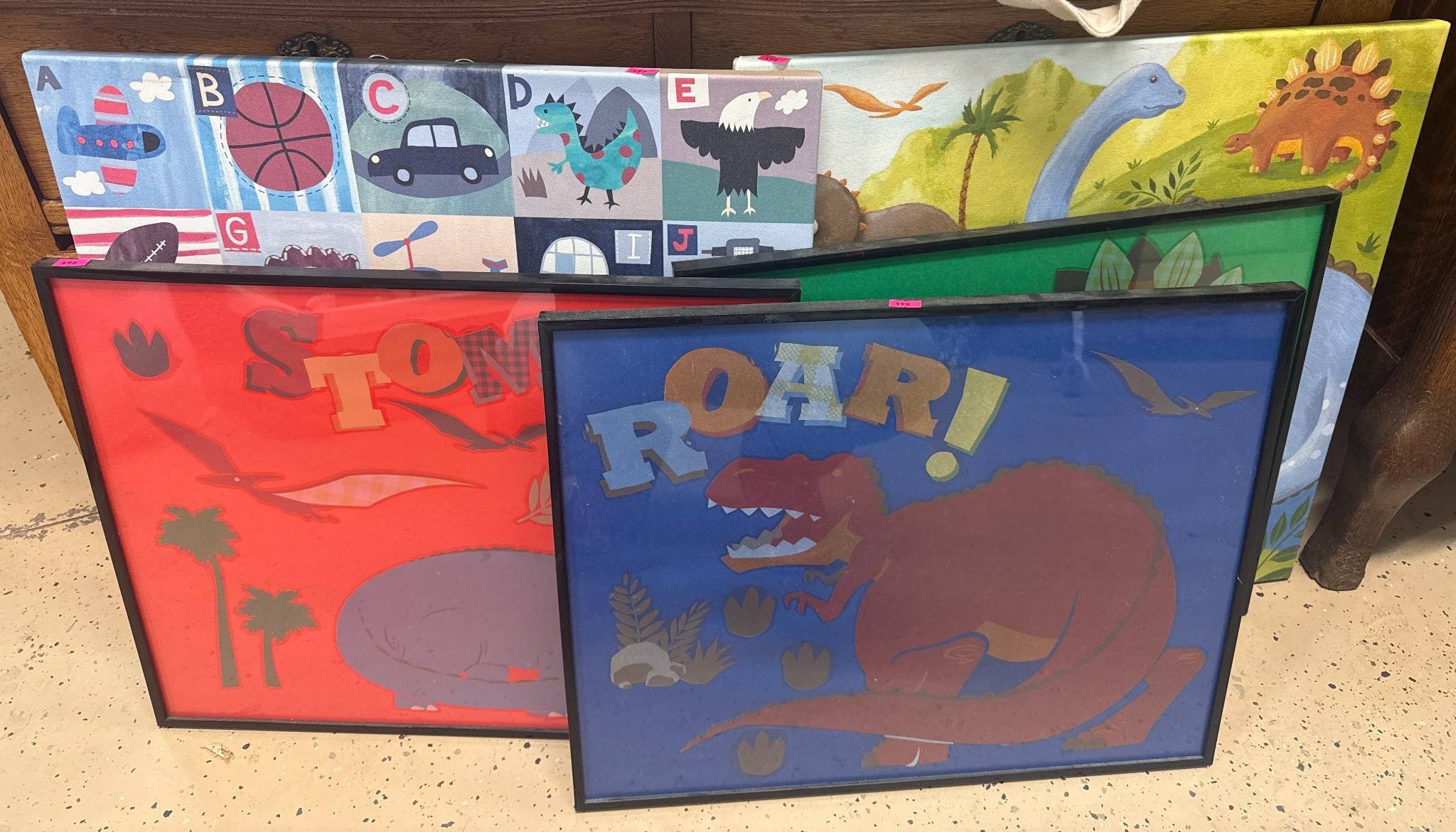 173 5 Framed and Unframed Dinosaur-Themed Artwork in Various Sizes