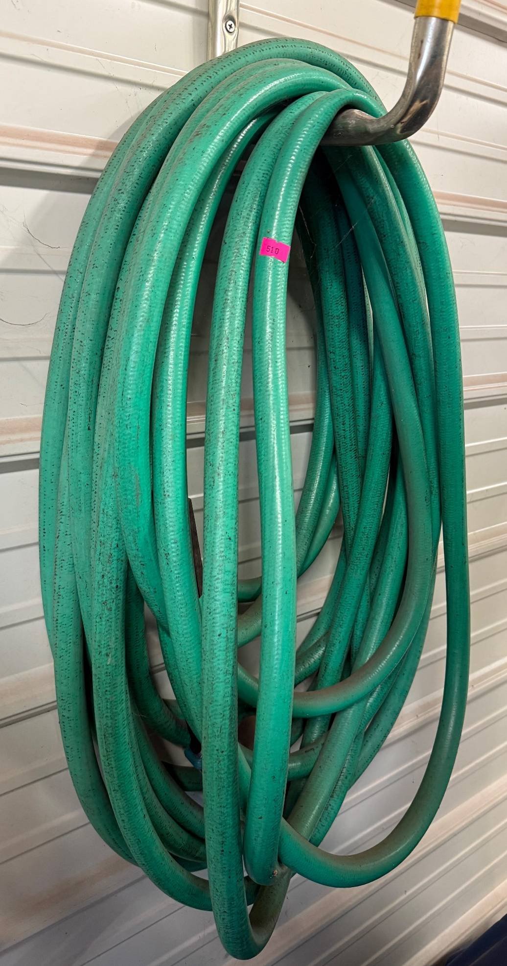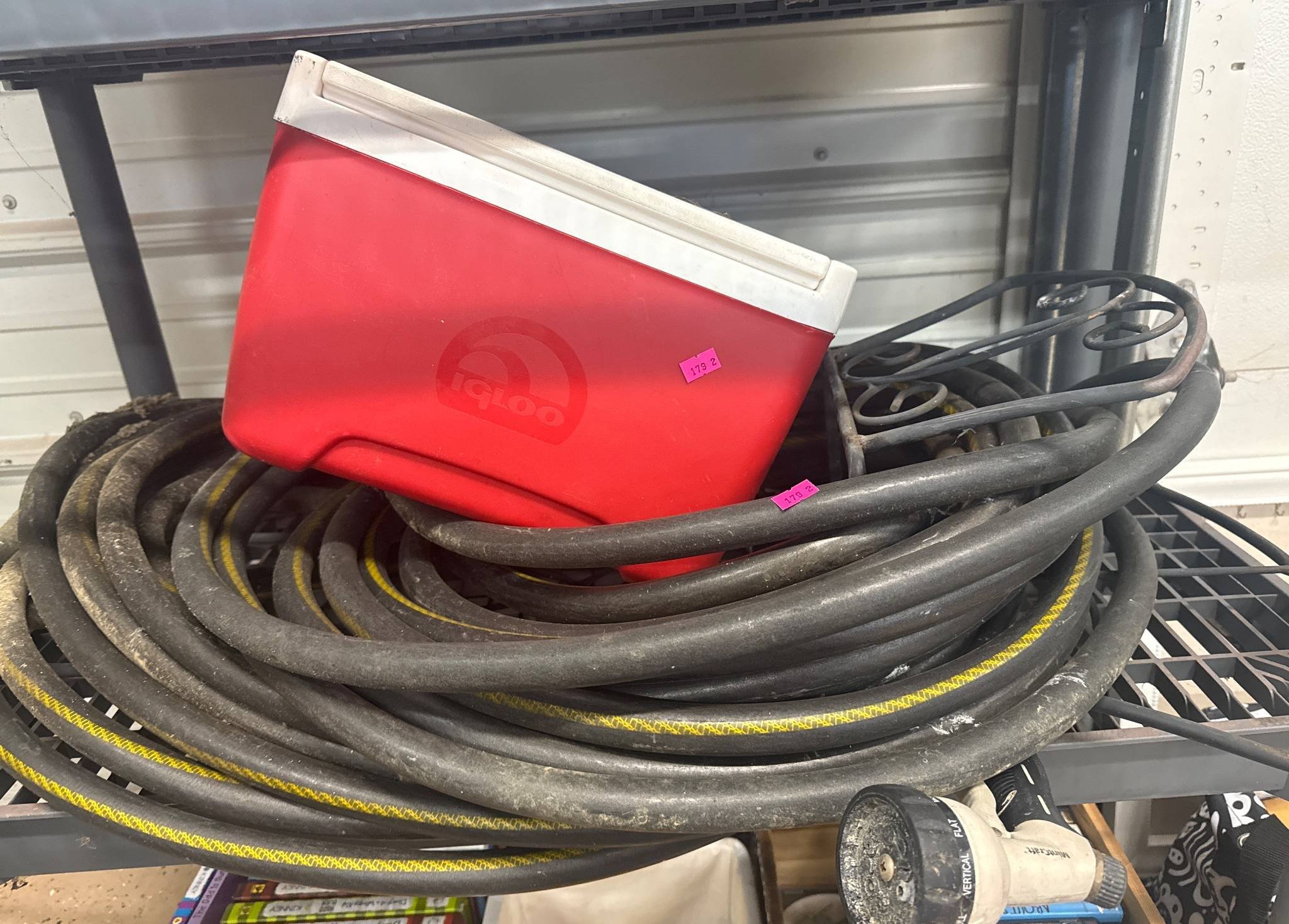 179 Red Igloo Plastic Insulated Cooler and 2 Garden Hoses with One Metal Hose Holder