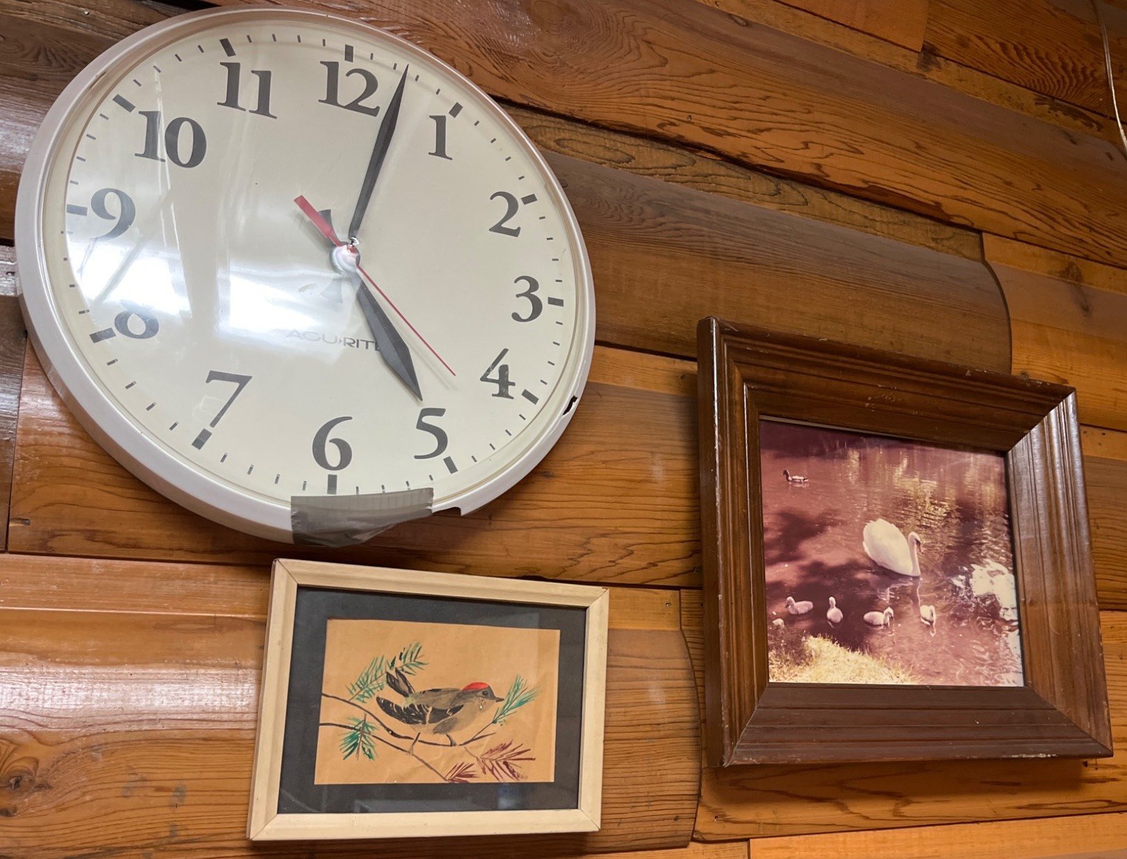 1006 Metal Mantel Clock, Painted Duck, and Wicker Basket with Pine Cones