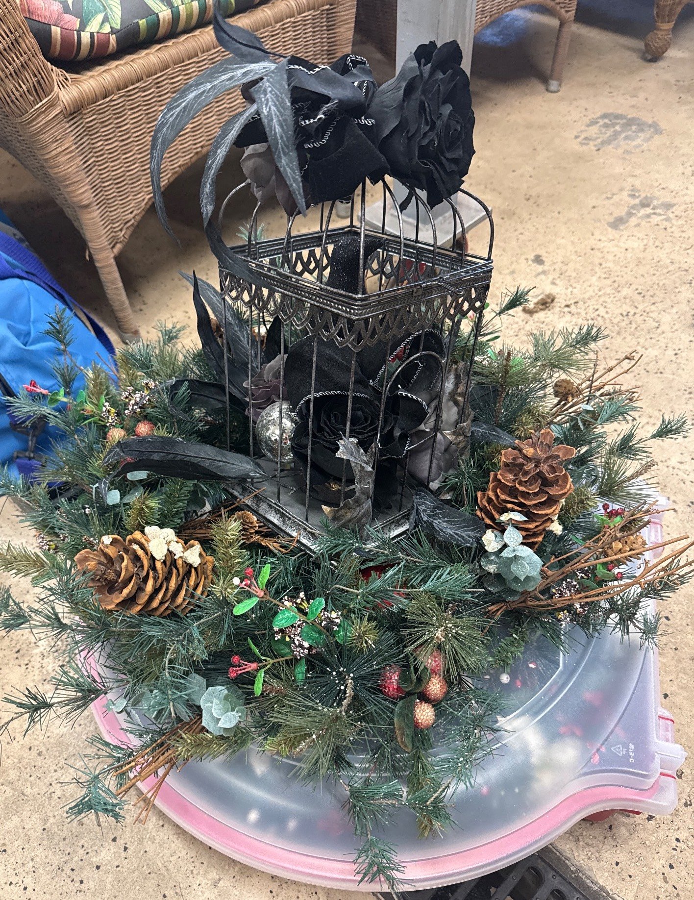 704 Artificial Fern in Woven Basket with Decorative Birdhouse