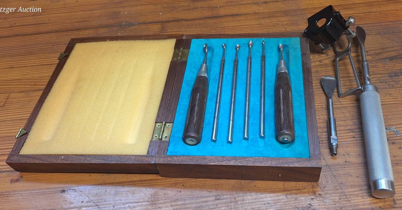 582 Precision Medical Instruments in Case with Wooden Handles and Steel Tools
