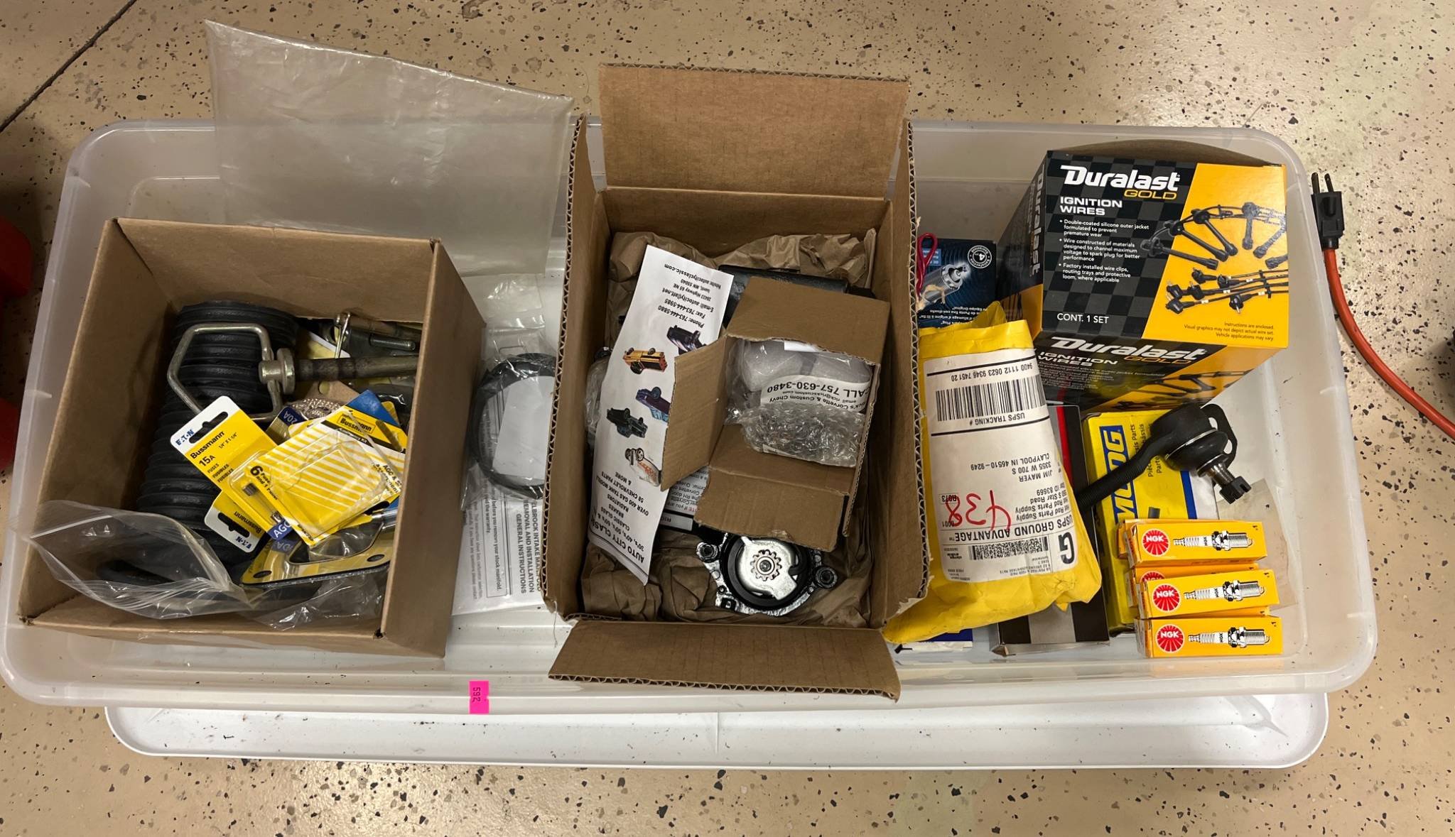 592 Automotive Parts Lot With Spark Plugs, Ignition Coils, and Various Components