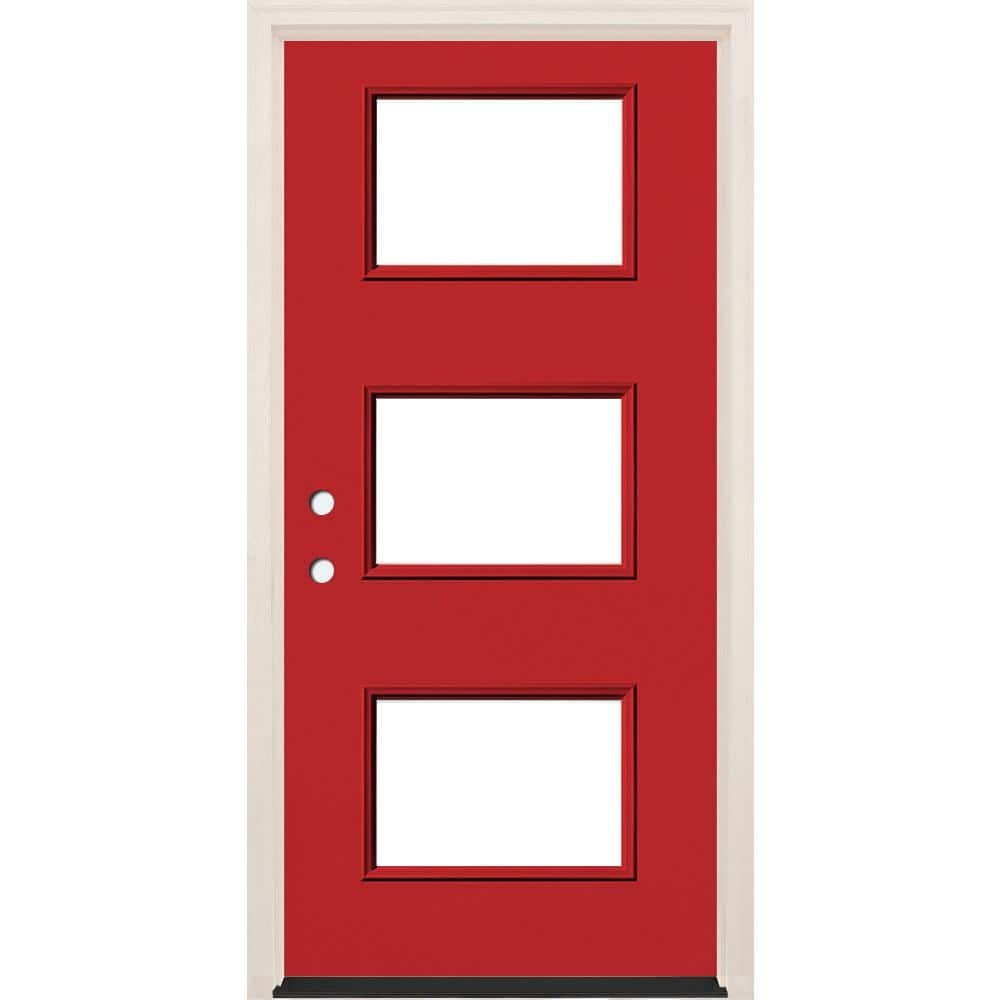 741002 BUILDERS CHOICE - 36 in. x 80 in. Right-Hand/Inswing 3 Lite Clear Glass Ruby Red Painted Fiberglass Prehung Front Door w/6-9/16 in. Frame