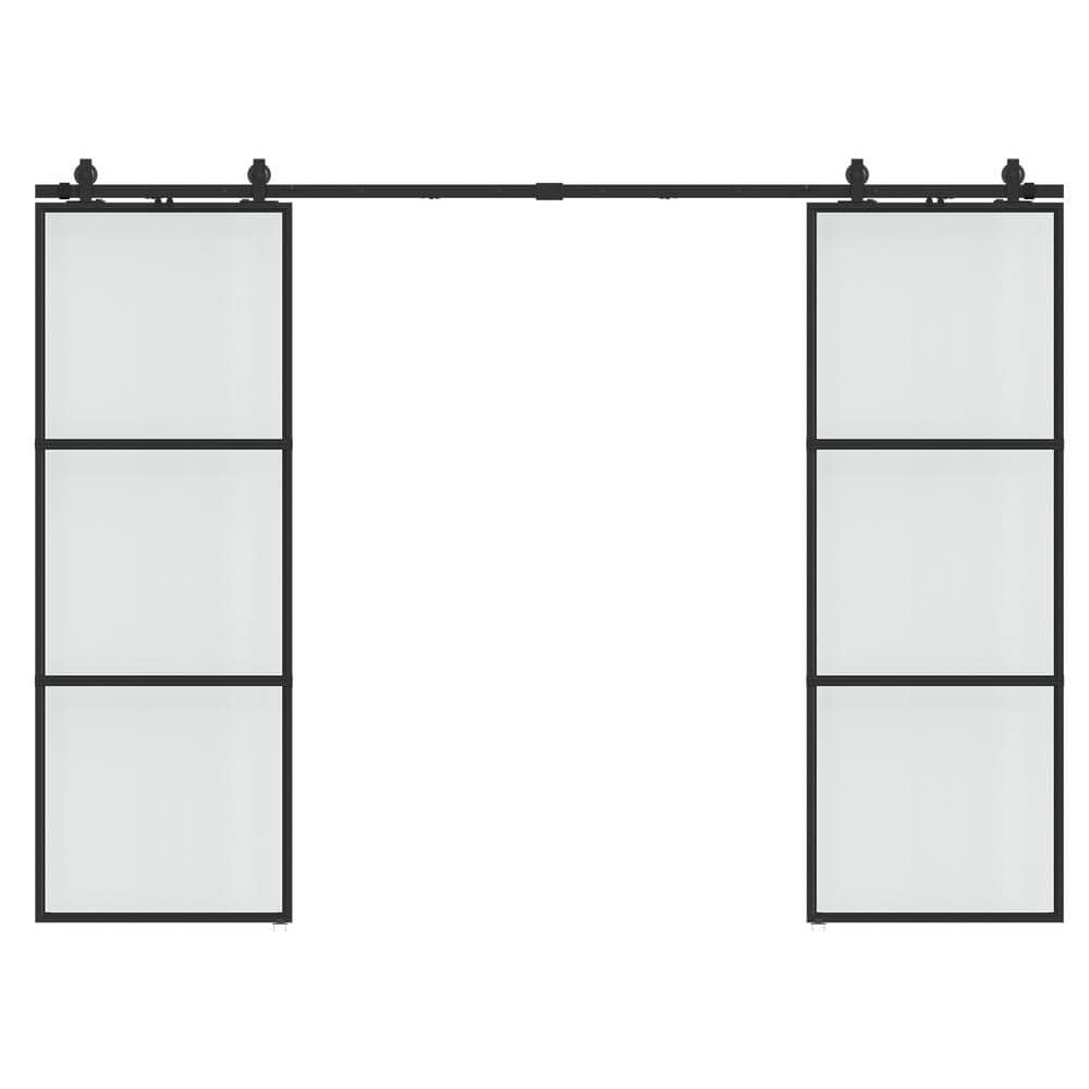 741010 SOCBAZZAR - 64 in. x 84 in. Full-lite Frosted Glass Black Metal Frame Double Sliding Barn Door with Hardware Kit and Soft-close