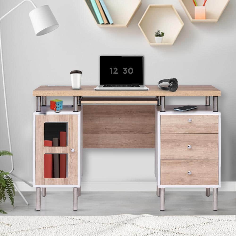 741092 "HOMESTOCK - 47.2 in. Contemporary White/Natural Wood 3-Drawer Desk with Keyboard Tray and USB Charging Station