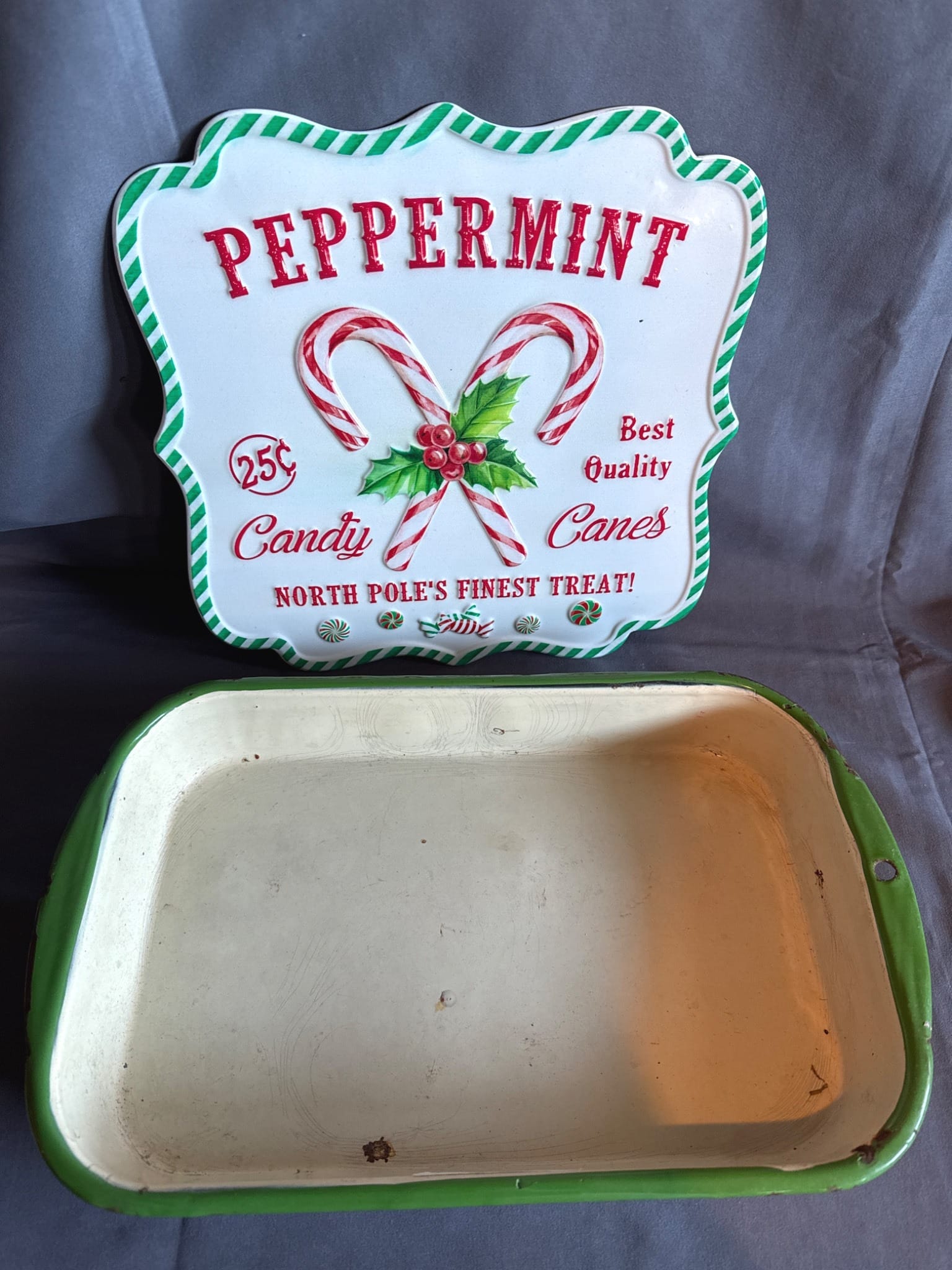1010 Metal Peppermint Candy Canes Wall Plaque and Green-Trimmed Enamel Tray, 10?, 15×10?