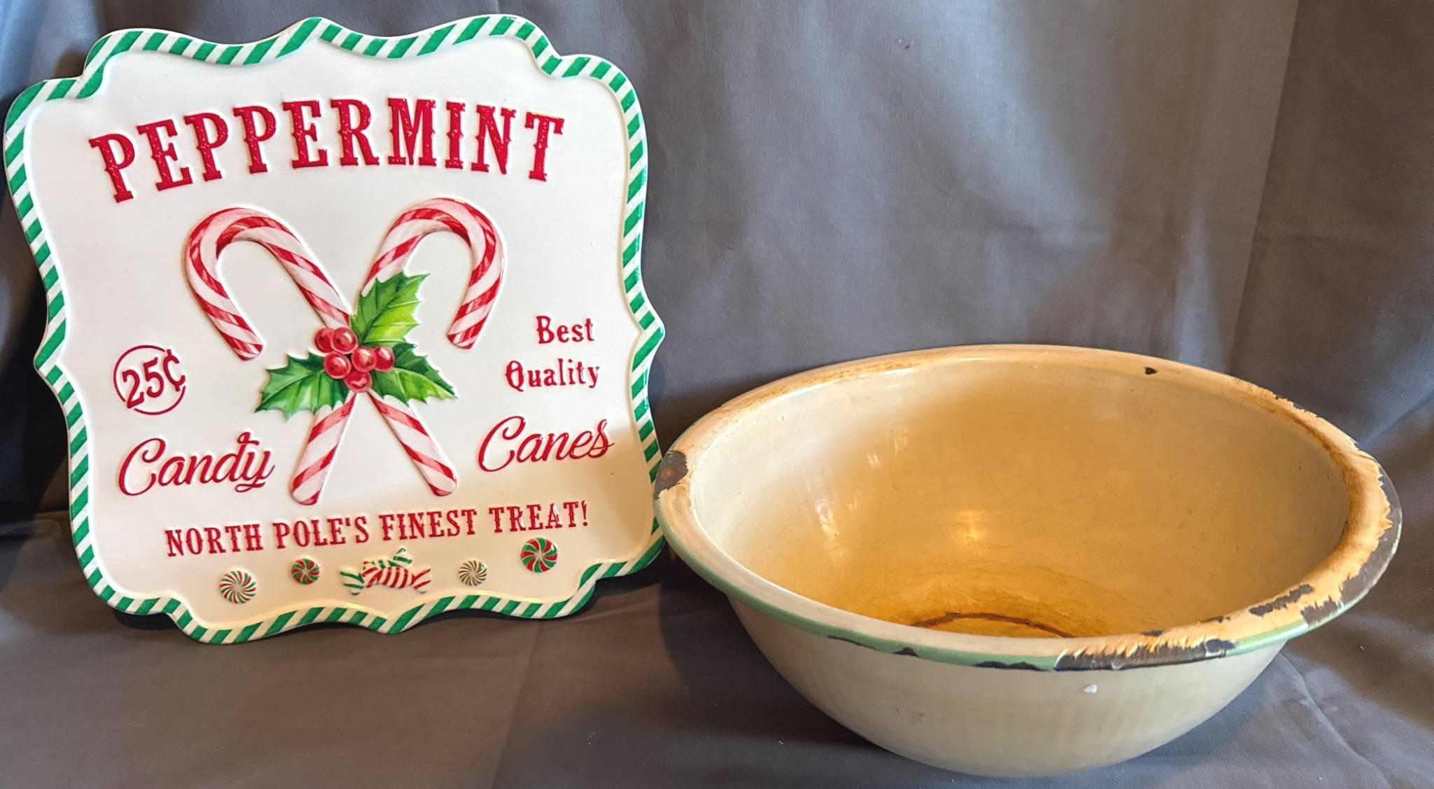 1015 Metal Peppermint Candy Sign and Enamel Bowl, 12?