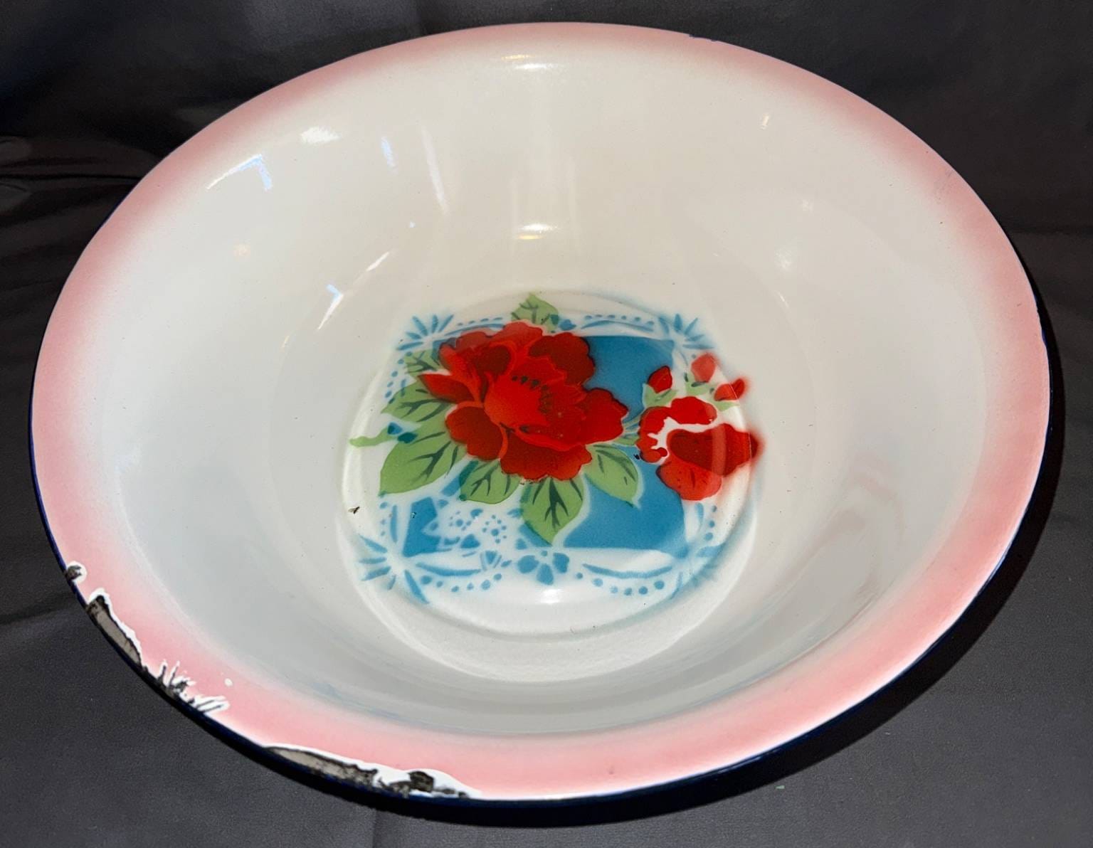 1017 Enamel Bowl with Pink Rim and Floral Design, 12?