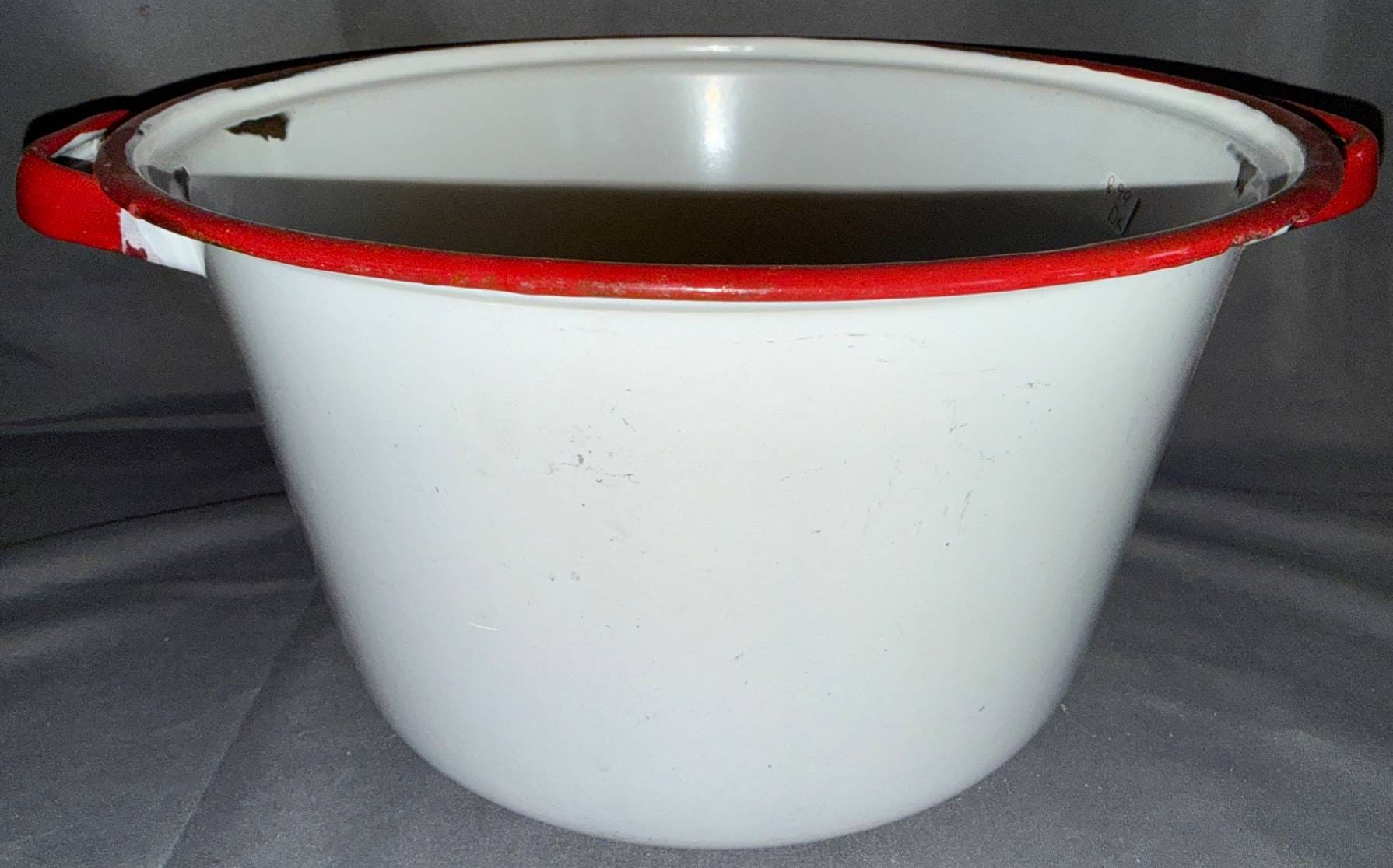 1022 White Enamel Bowl with Red Rim and Dual Handles, 13?