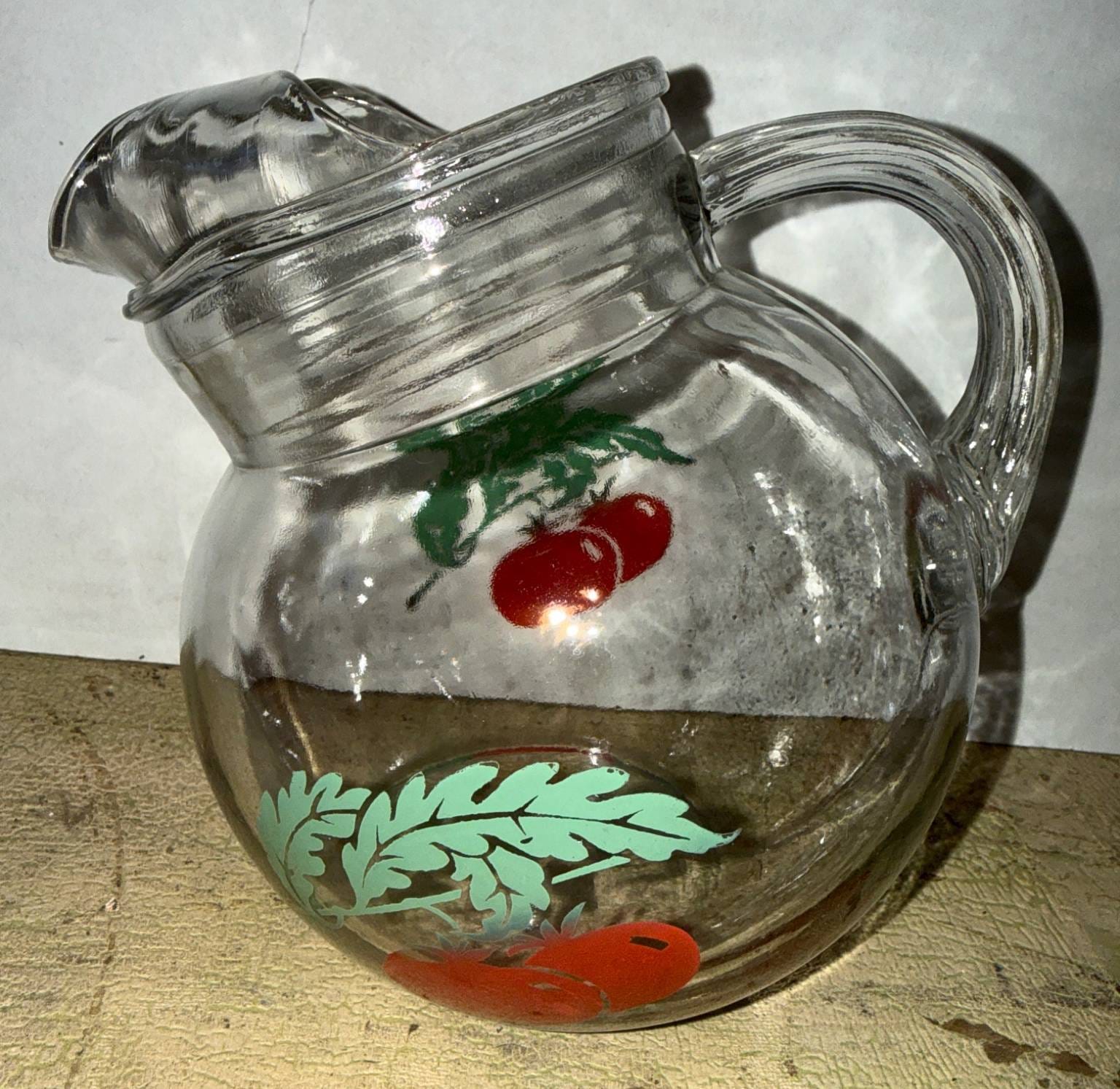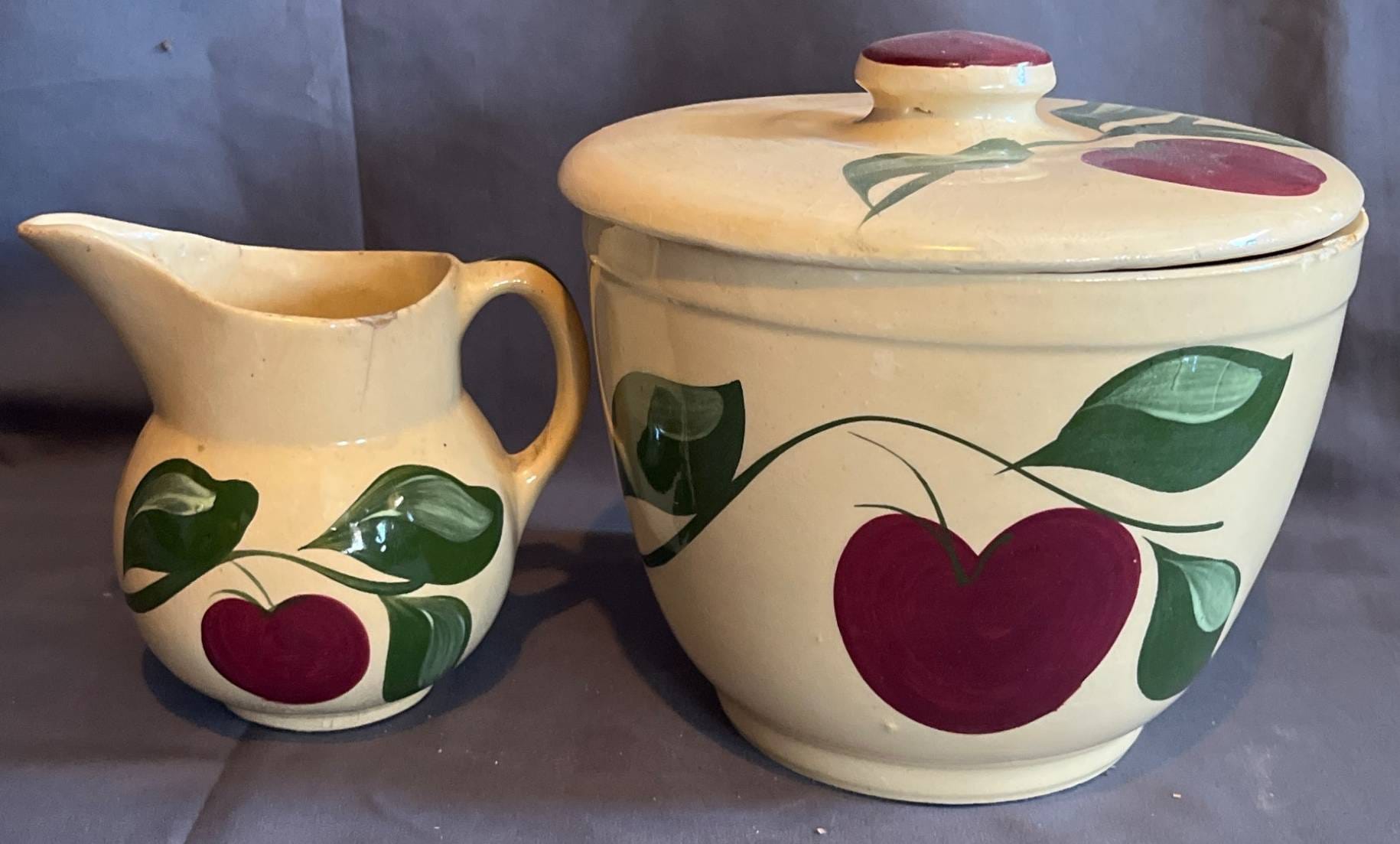 58 Watt Pottery Cream-Colored Stoneware Pitcher and Lidded Jar with Apple Motif (chipping, cracks)
