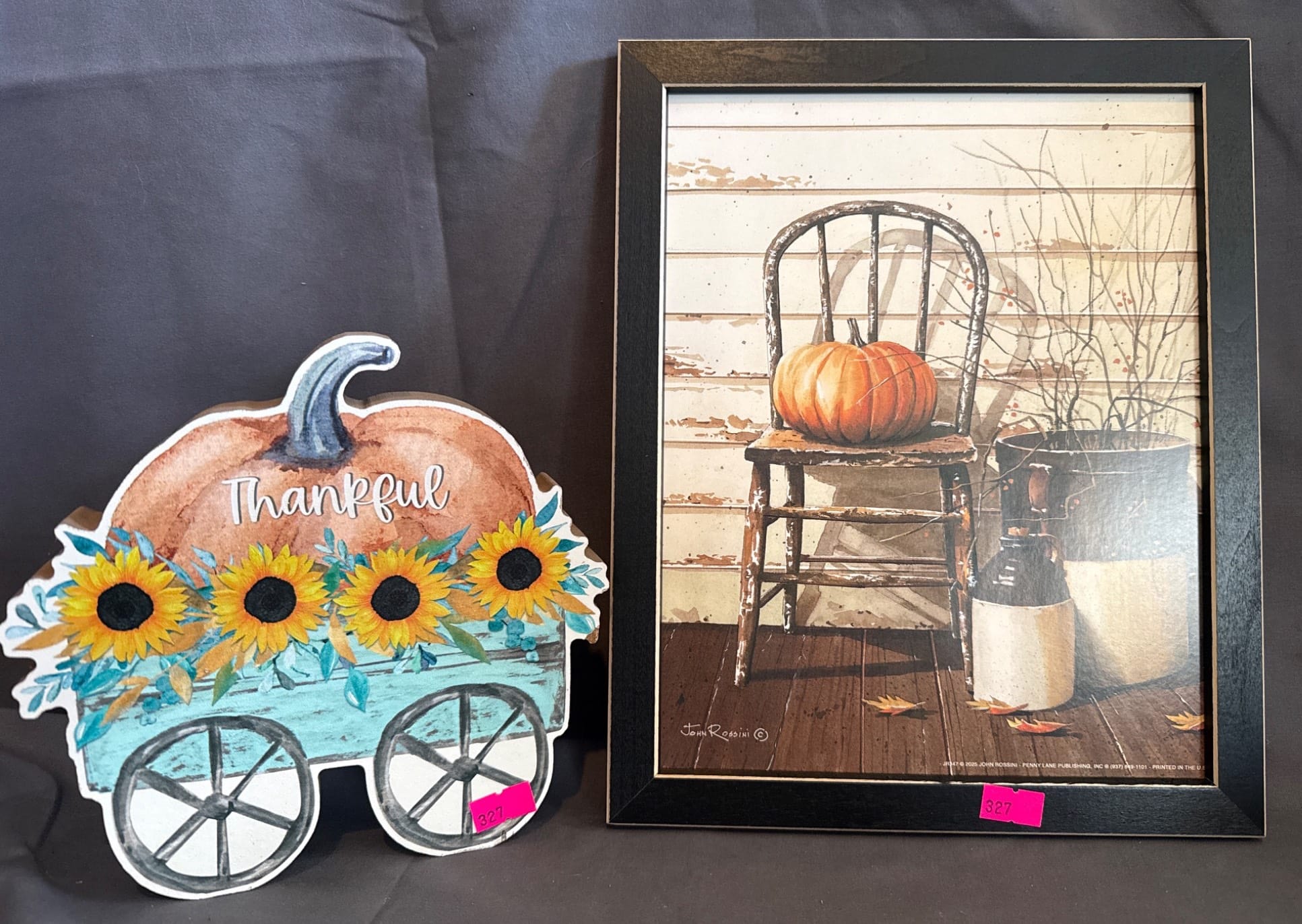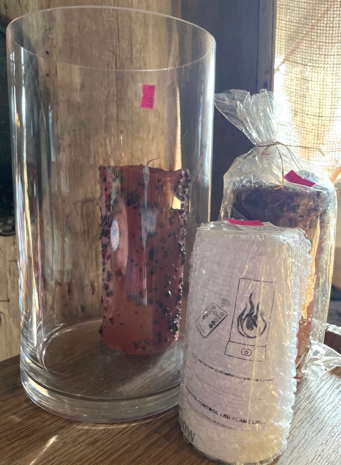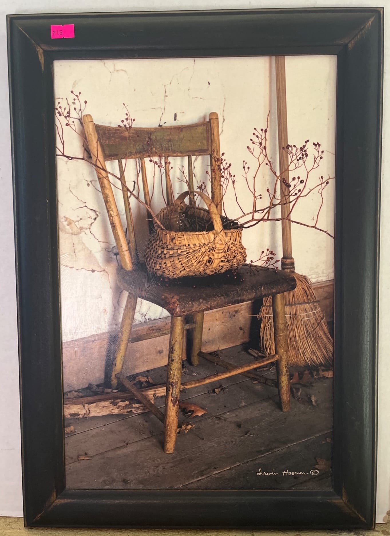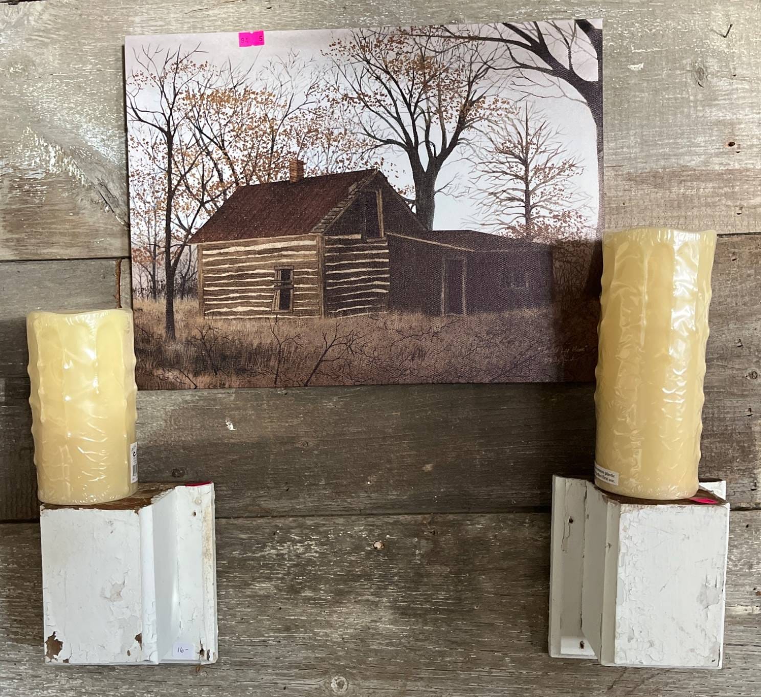 84 Framed Print ‘The Old Log Home’ by Billy Jacobs with 2 White Candle Holders, 12×16?