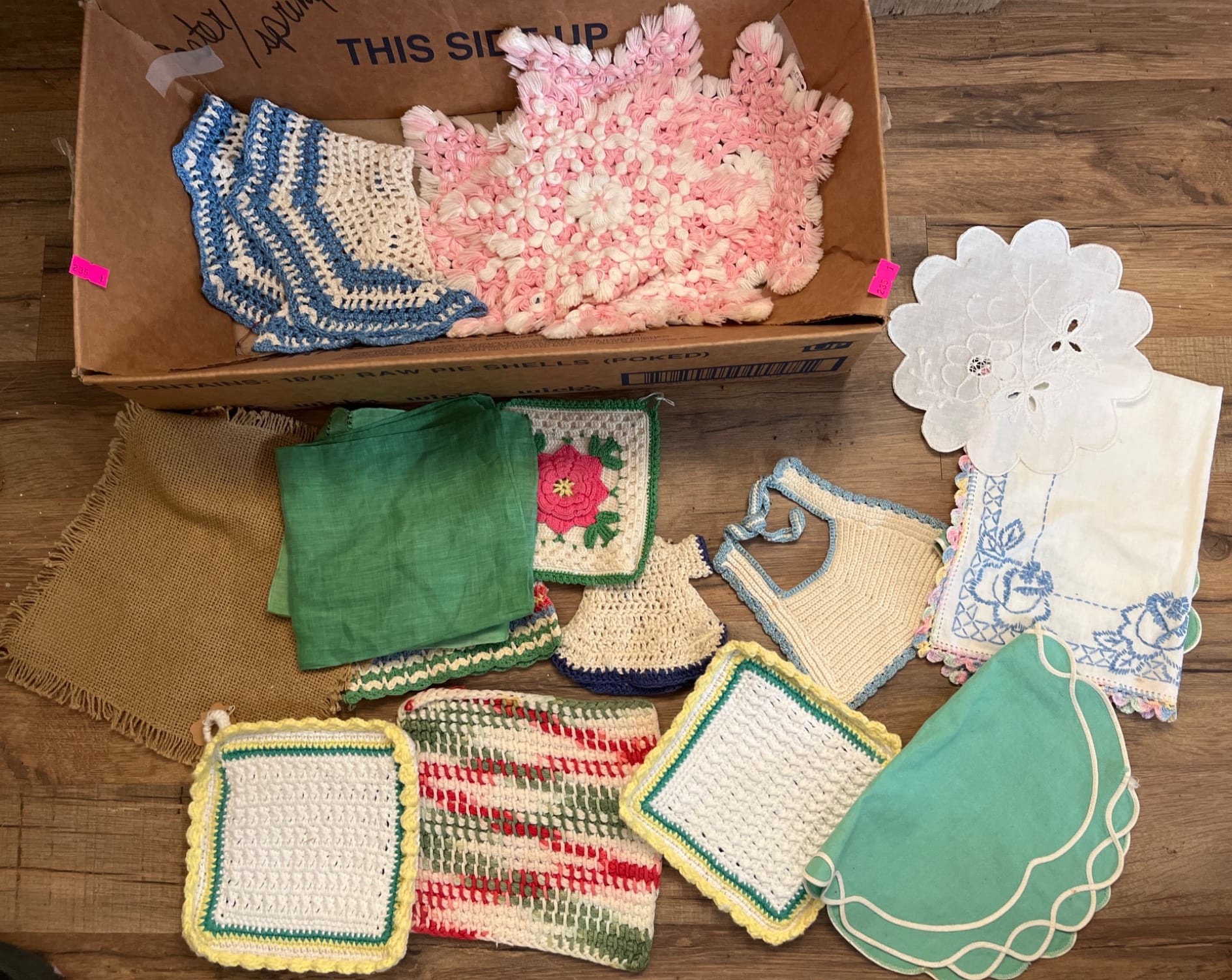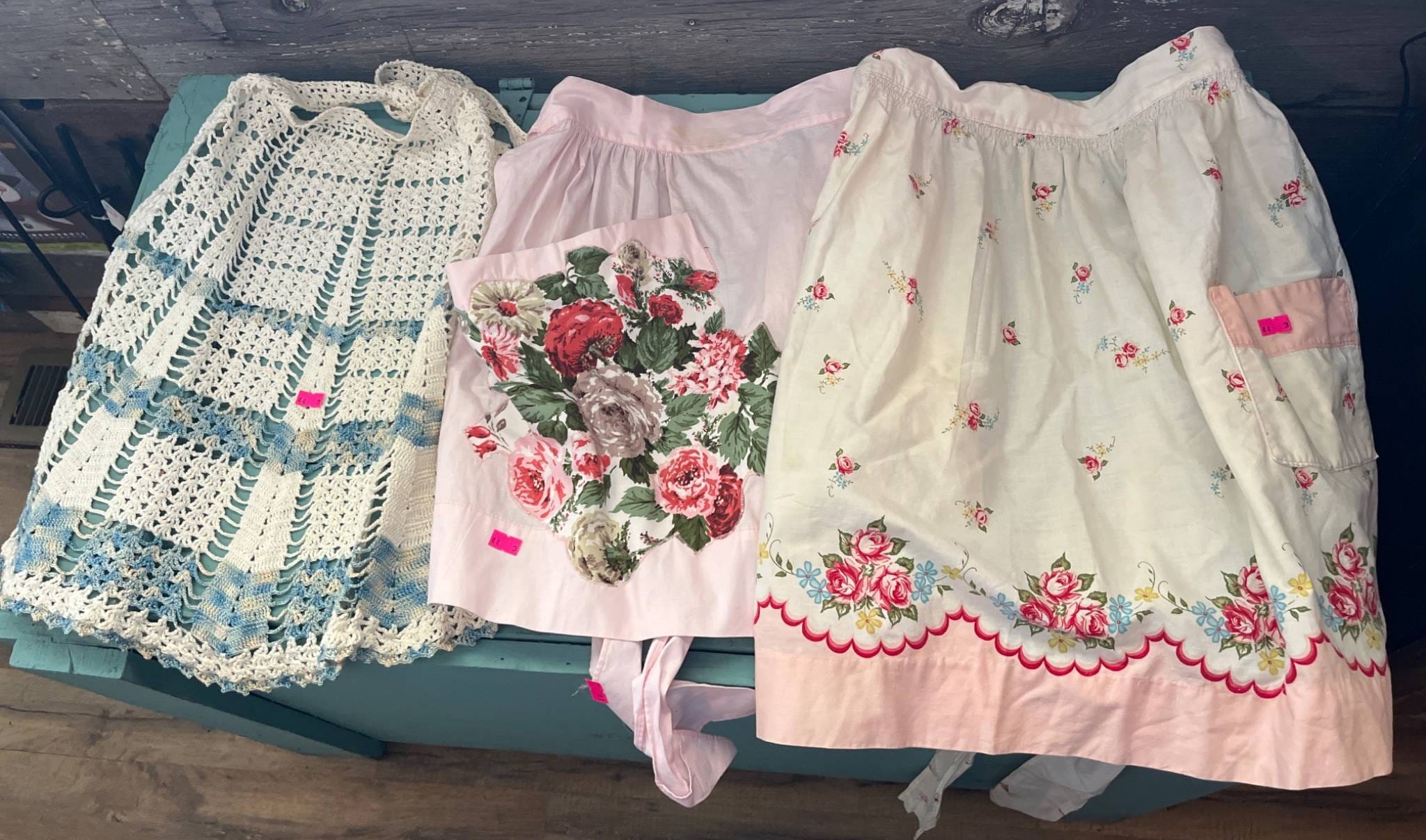 44 3 Aprons with Floral Embellishments and 1 Crocheted Apron