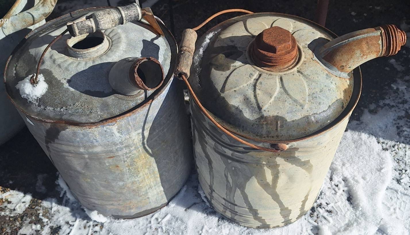 3013 2 Metal 5-Gallon Oil or Gasoline Cans with Handles and Spouts