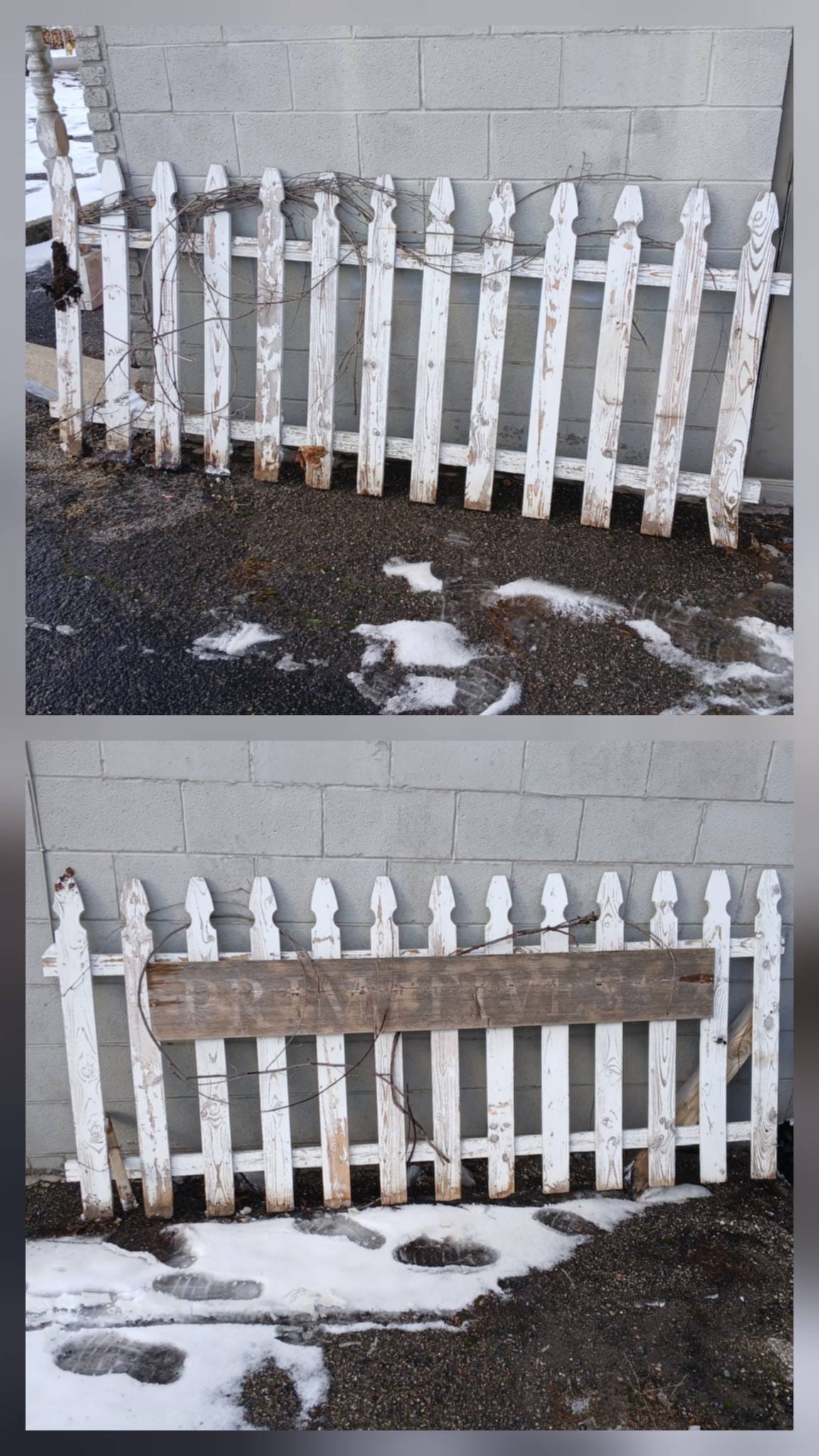 3019 2 White Picket Fence Panels with Visible Wear, 6ft x 30in Each