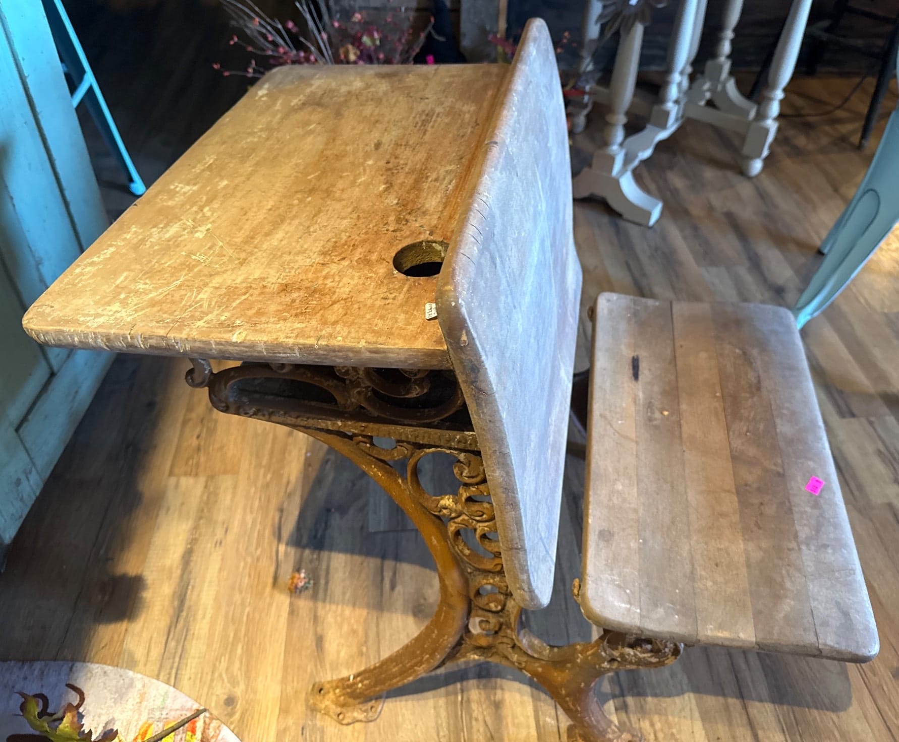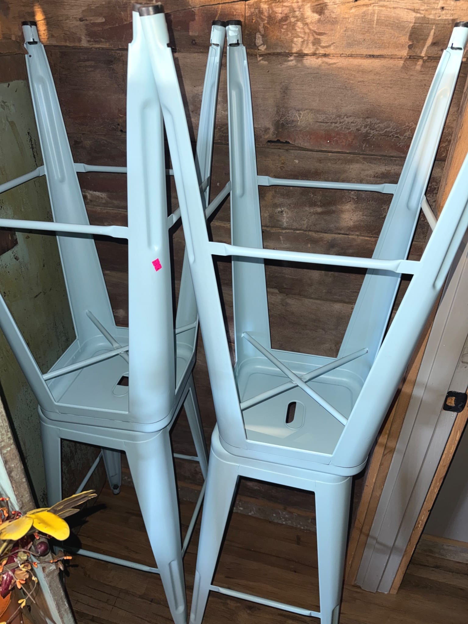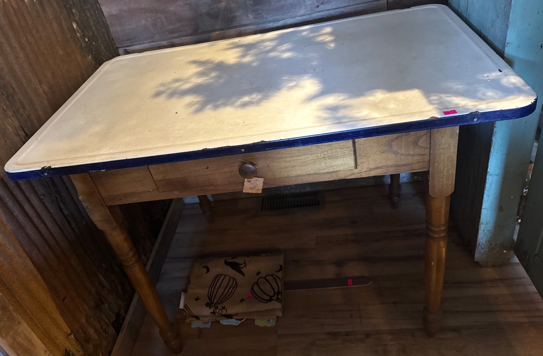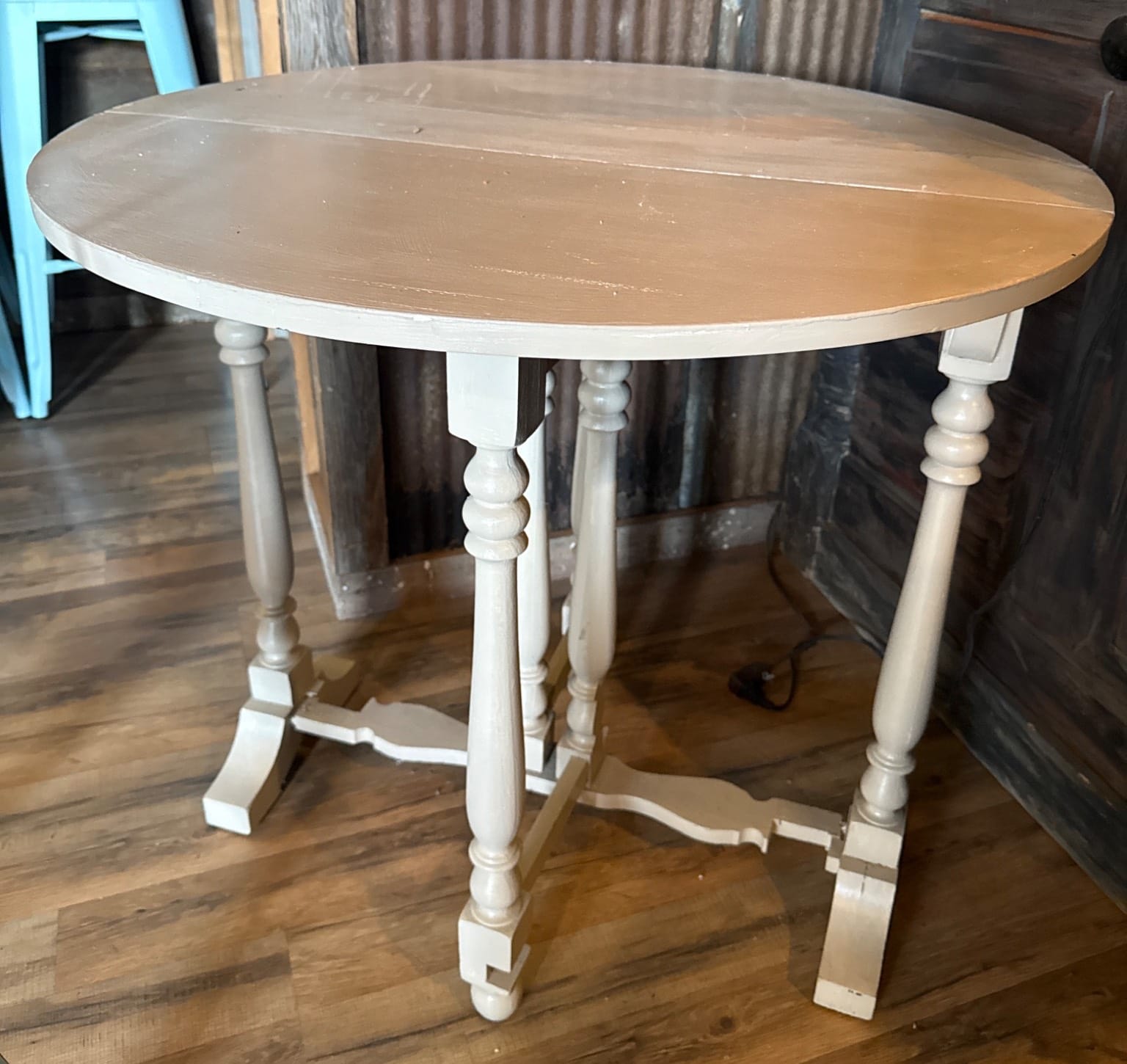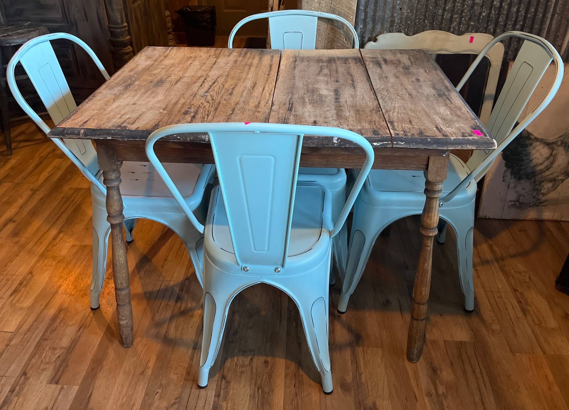 9 Rustic Table with Turned Legs and 4 Light Blue Metal Chairs, 38x28x39.5?