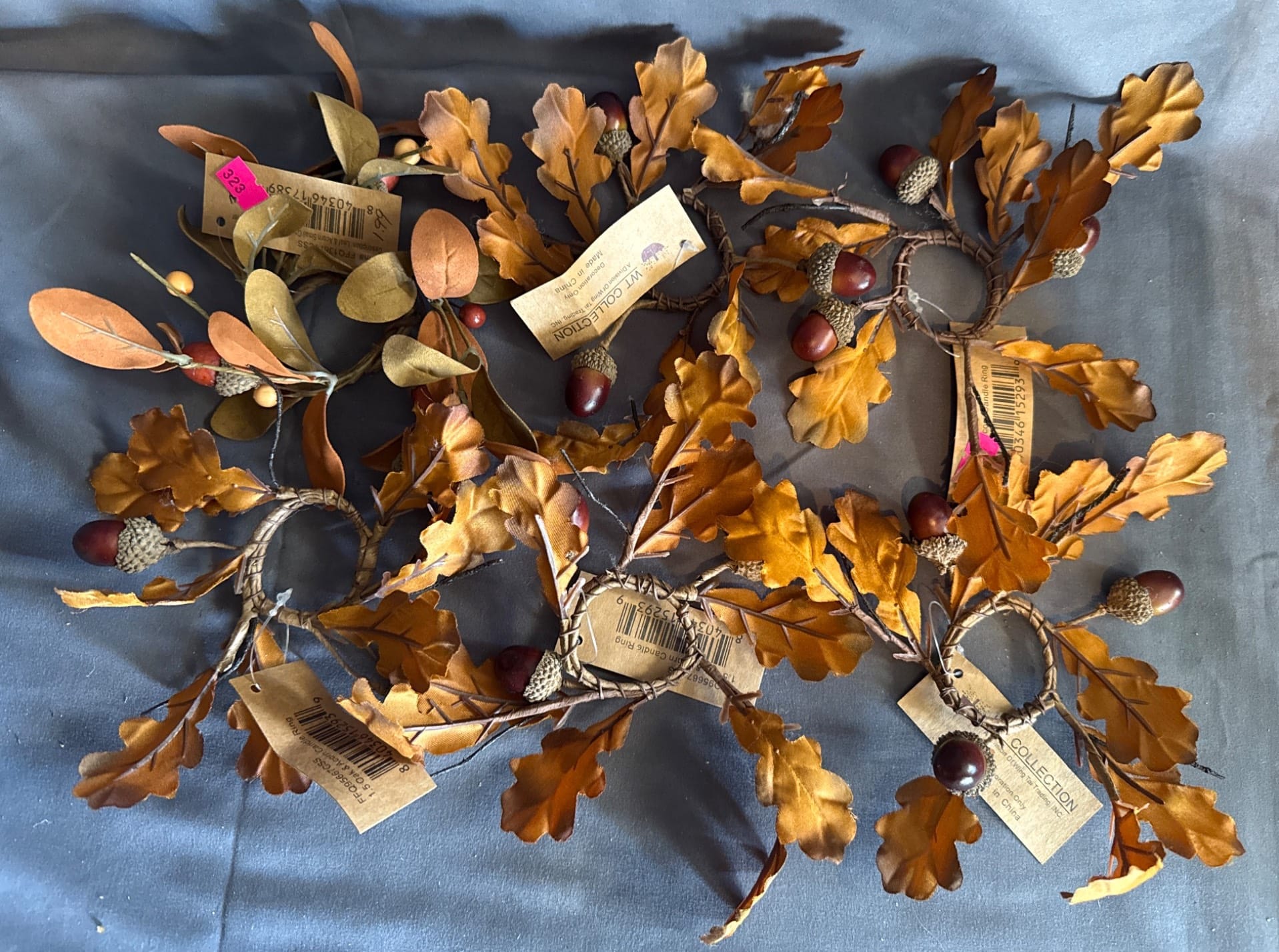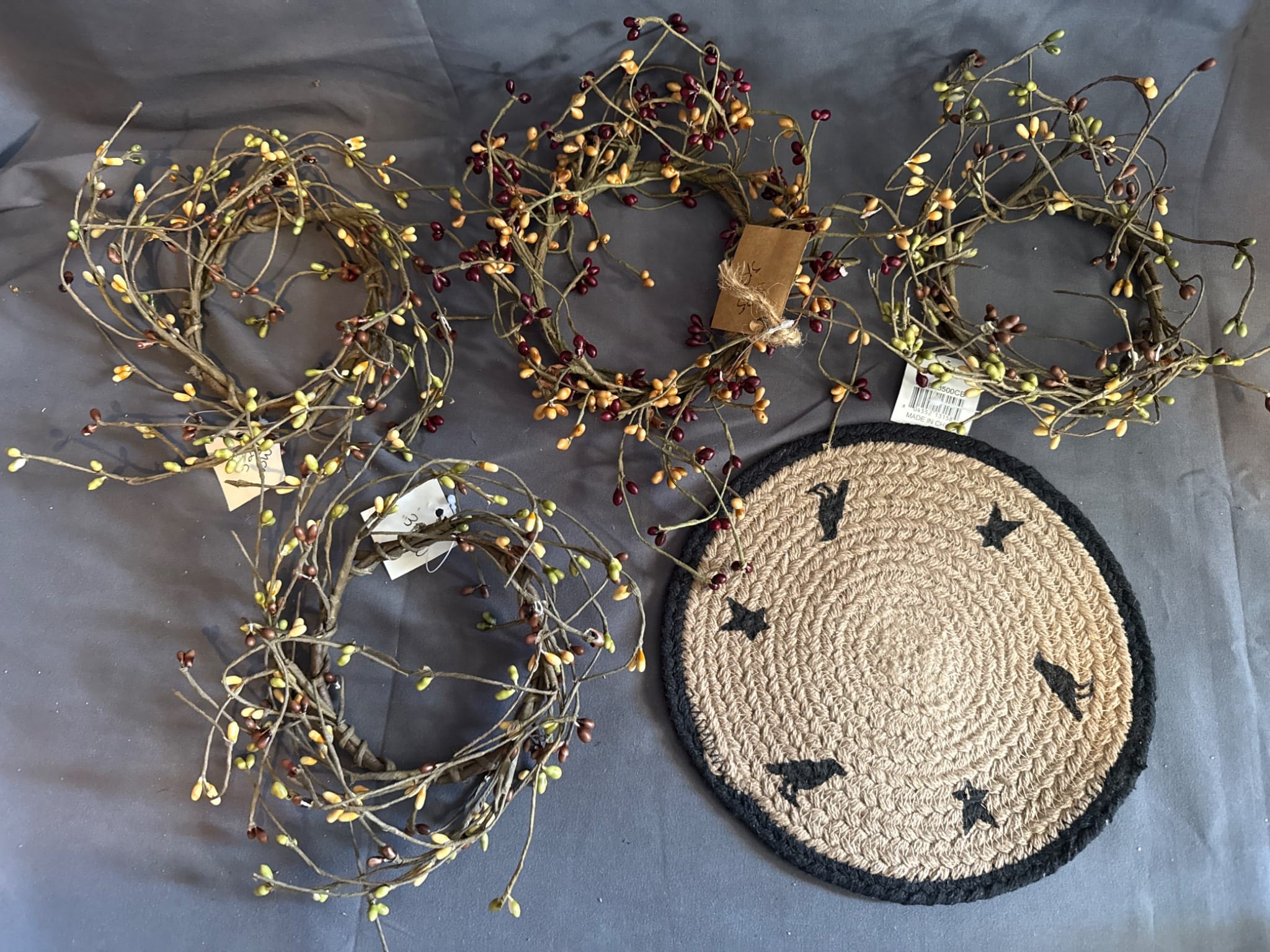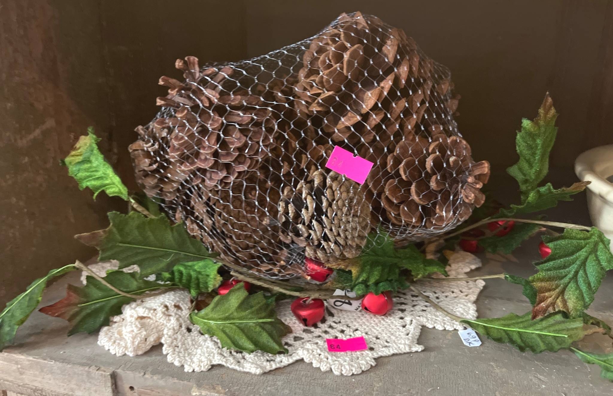 64 Cinnamon Pine Cones with Crochet Doily and Faux Holly Candle Ring