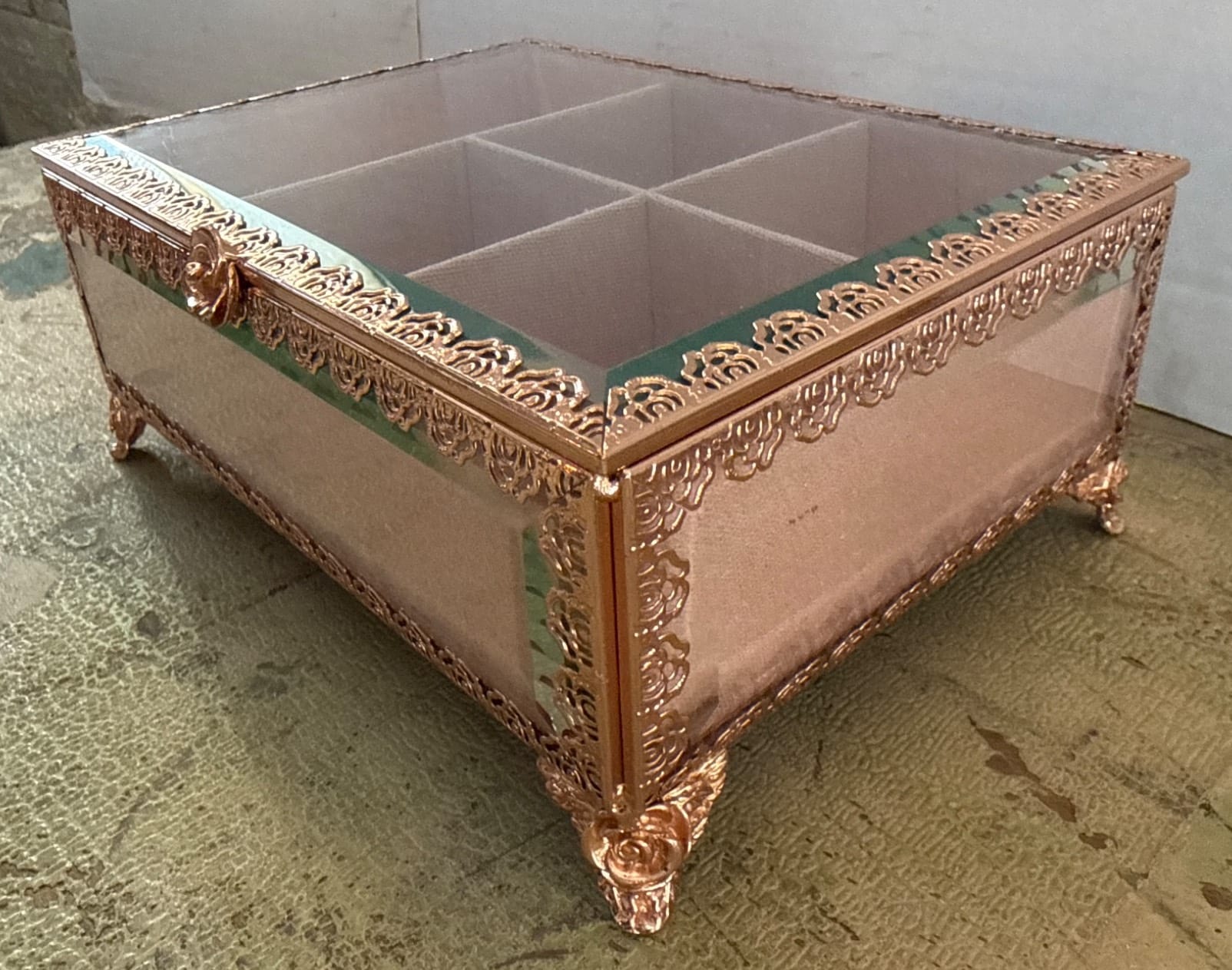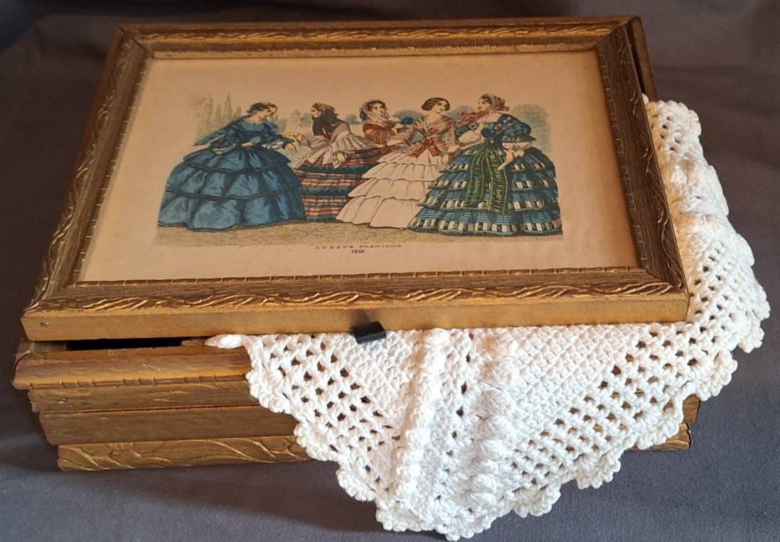 517 Gold-Tone Box with Godey’s Fashions Print and Crochet Textile, 6.5×8.5×2.5?
