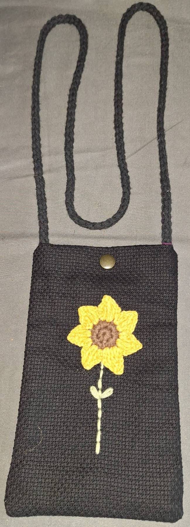 516 Black Crochet Shoulder Pouch with Sunflower Embellishment, 7?