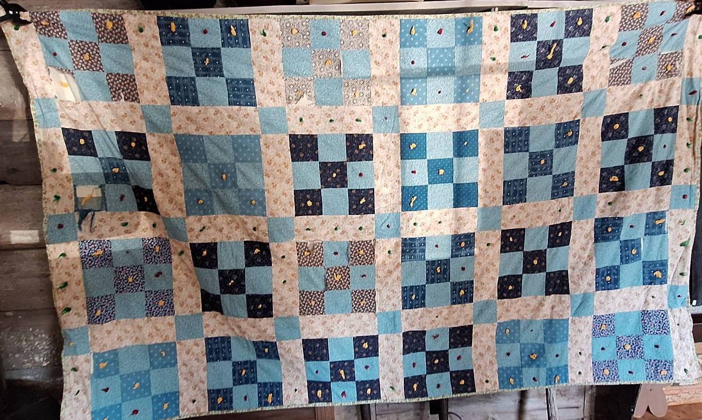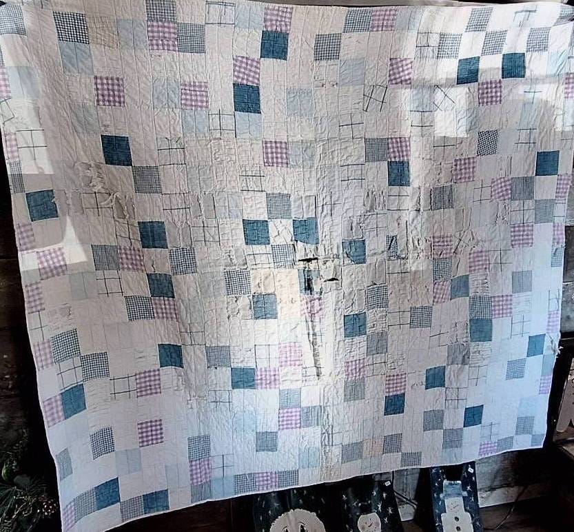 605 Patchwork Quilt With Blue, Pink, and White Squares, 60×69 (shows wear, holes)