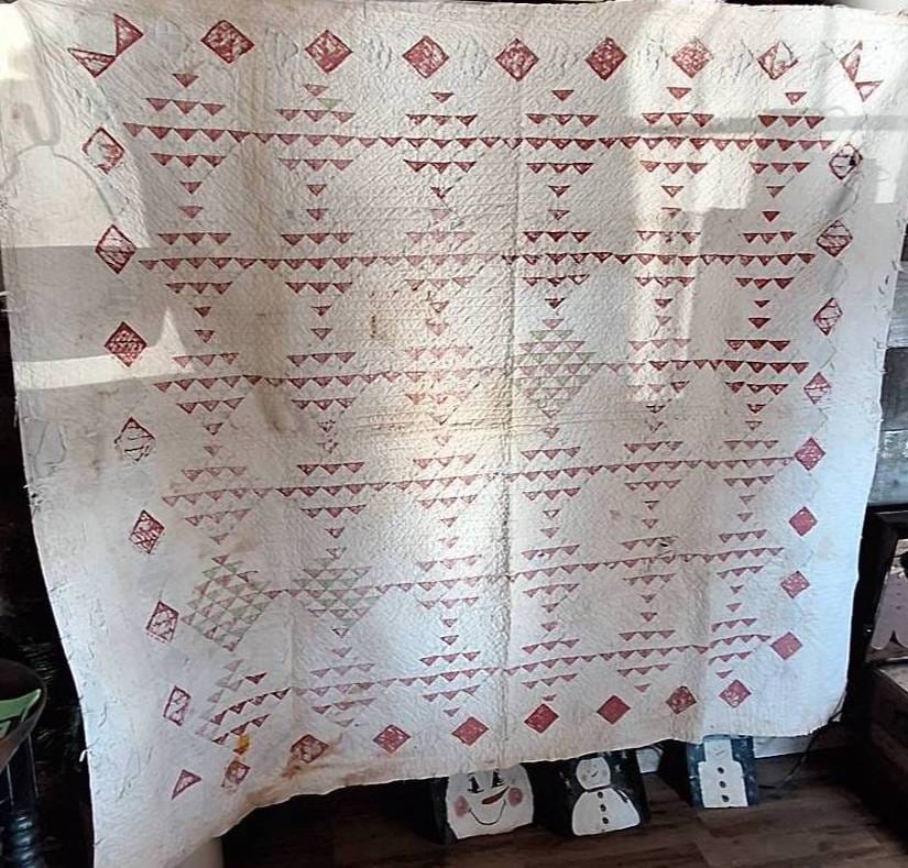 604 Hand-Quilted Textile Featuring Red and White Geometric Patterns, 66×75