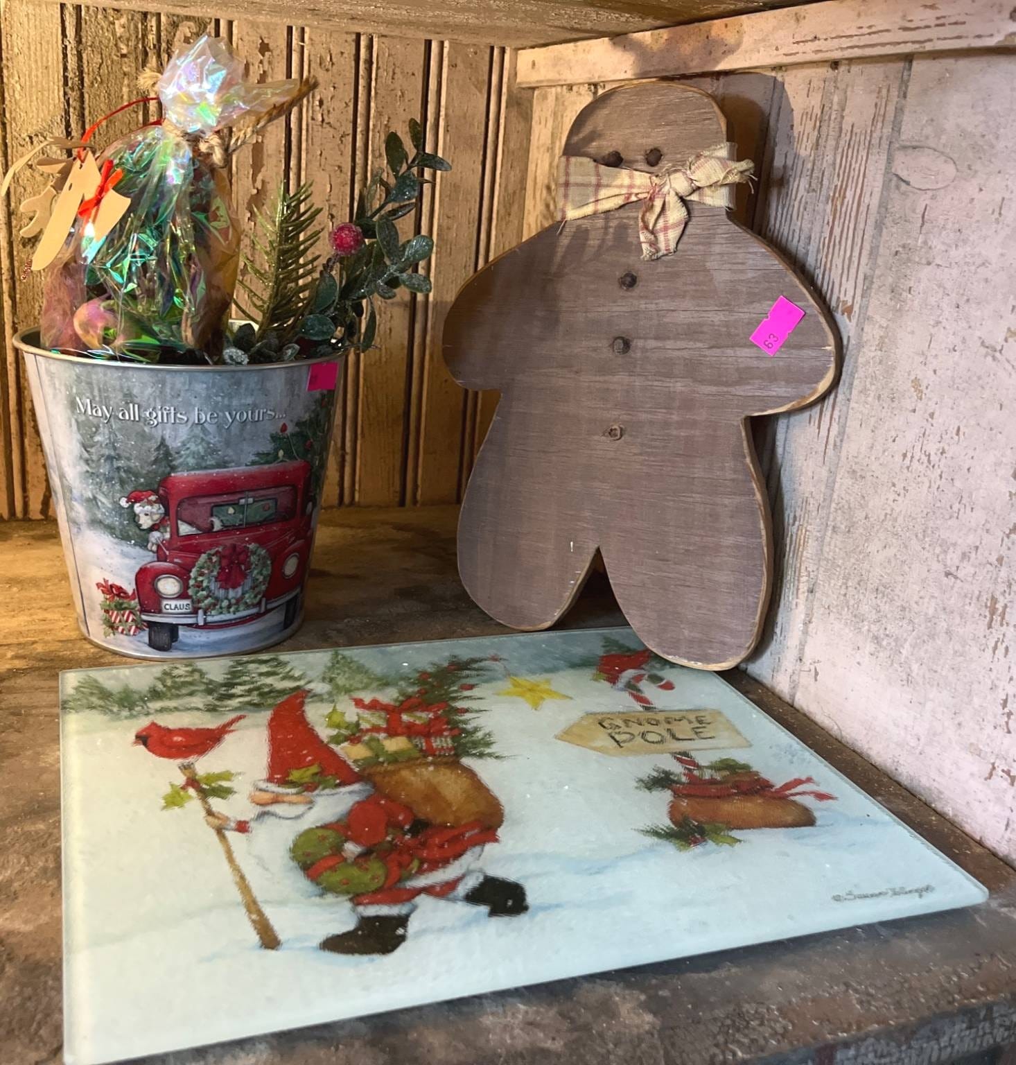 63 Holiday-Themed Items Inc. Gingerbread Man Decor, Bucket, and Glass Cutting Board